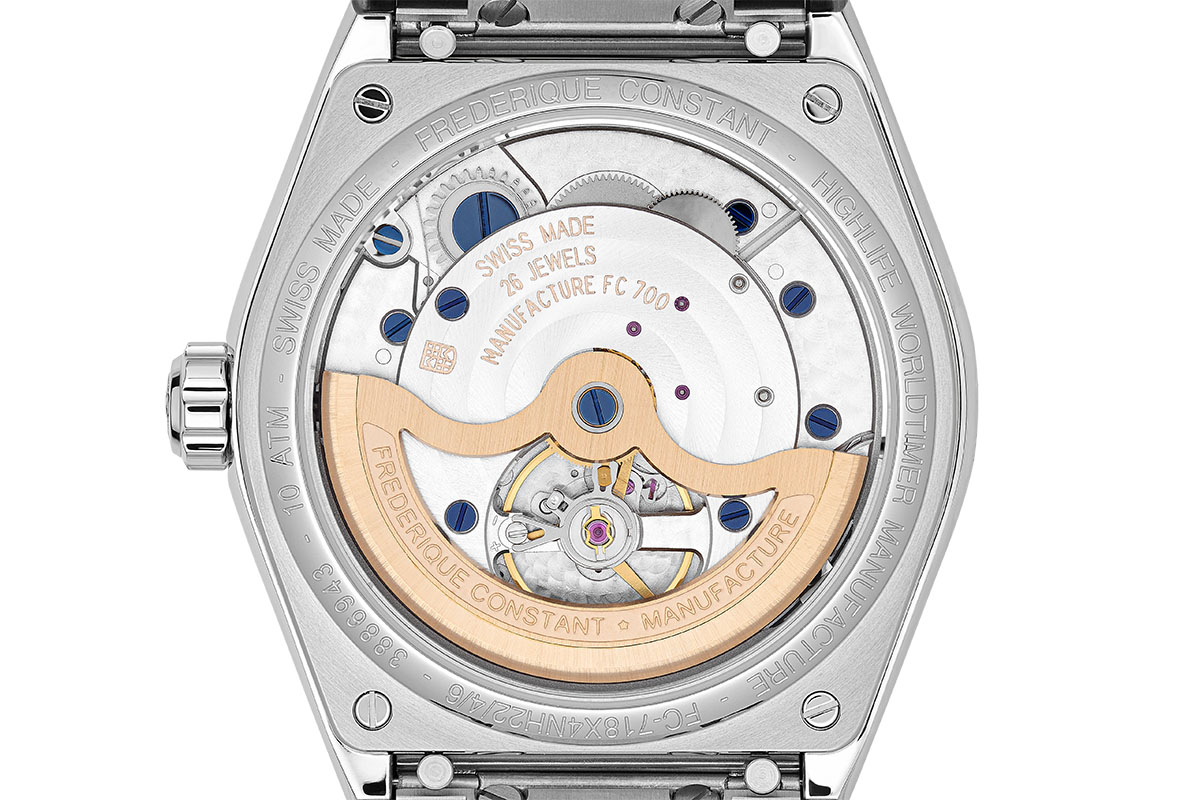 Il rotore placcato oro ha una finitura spazzolata verticale e reca inciso il nome del marchio insieme alla dicitura “Manufacture”, un’orgogliosa certificazione della qualità del movimento. Il calibro FC-718 equipaggia al momento tutti i Worldtimer di Frederique Constant, sia nella classica collezione Manufacture, sia nella più recente Highlife.