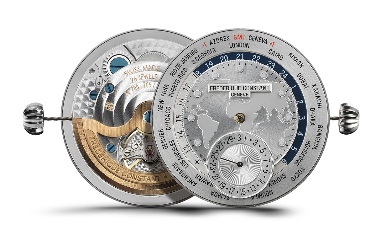 Nello specifico, il calibro FC-718 deriva dall’FC-710 al quale aggiunge il disco per le ore universali al movimento con secondi centrali. Entrambi i movimenti si basano sul Maxime Manufacture FC-700 del 2009, che è stato il secondo movimento in-house di Frederique Constant dopo l’FC-910.