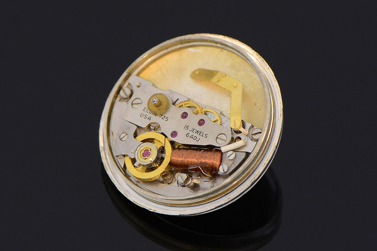 Proprio come accadde con il prototipo francese, il calibro 722 non si rivelò per niente adatto alla produzione industriale: troppo piccolo, troppo diverso da ciò che offriva il mercato, aveva bisogno di un’esperienza non ancora raggiunta. La Elgin passò oltre e nacque così il calibro 725. Un po’ più grande del precedente (25 mm di lunghezza), montava un’unica pila – trasferita sul fondello già nella versione definitiva del calibro 722. L’utilizzo di due pile, necessariamente impossibilitate ad avere lo stesso voltaggio, creava correnti parassite che ne riducevano la durata.