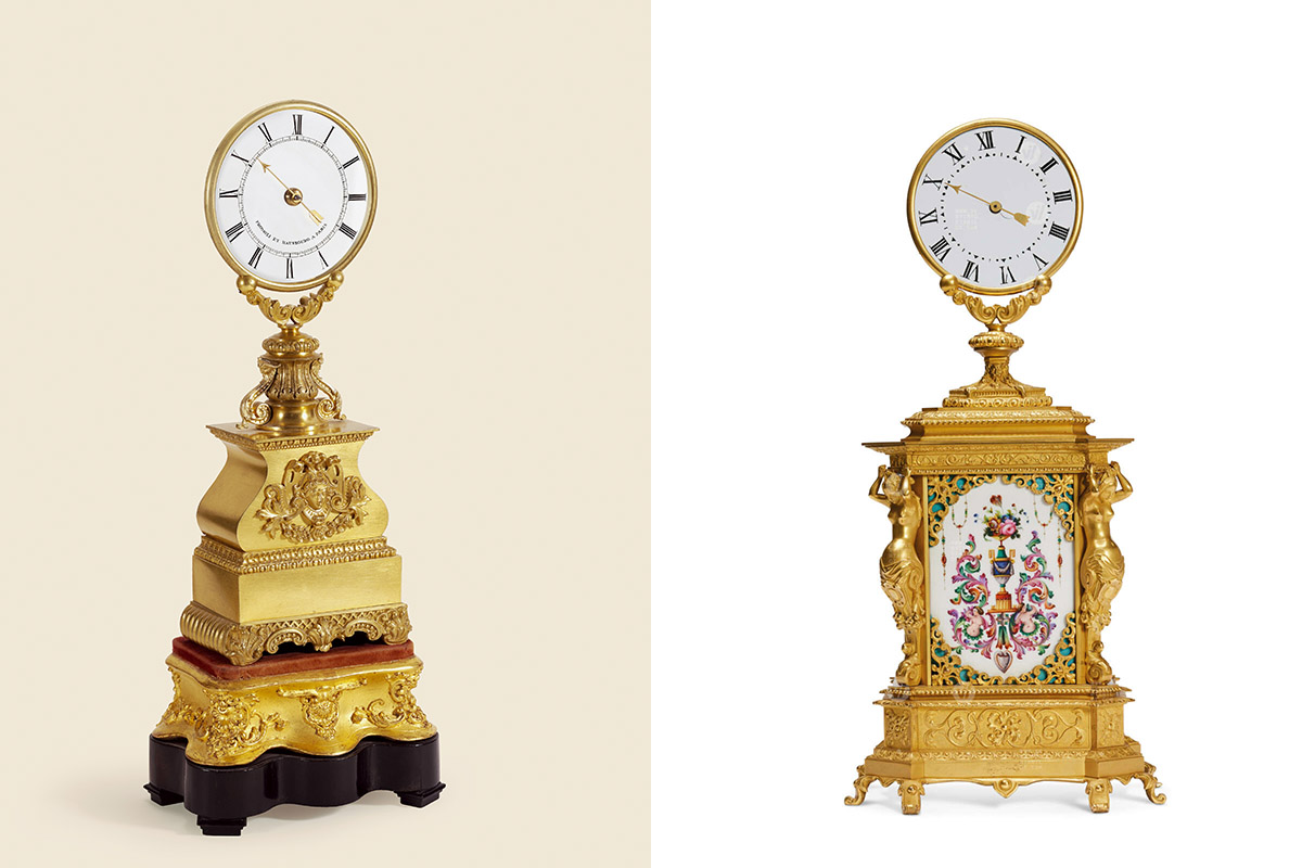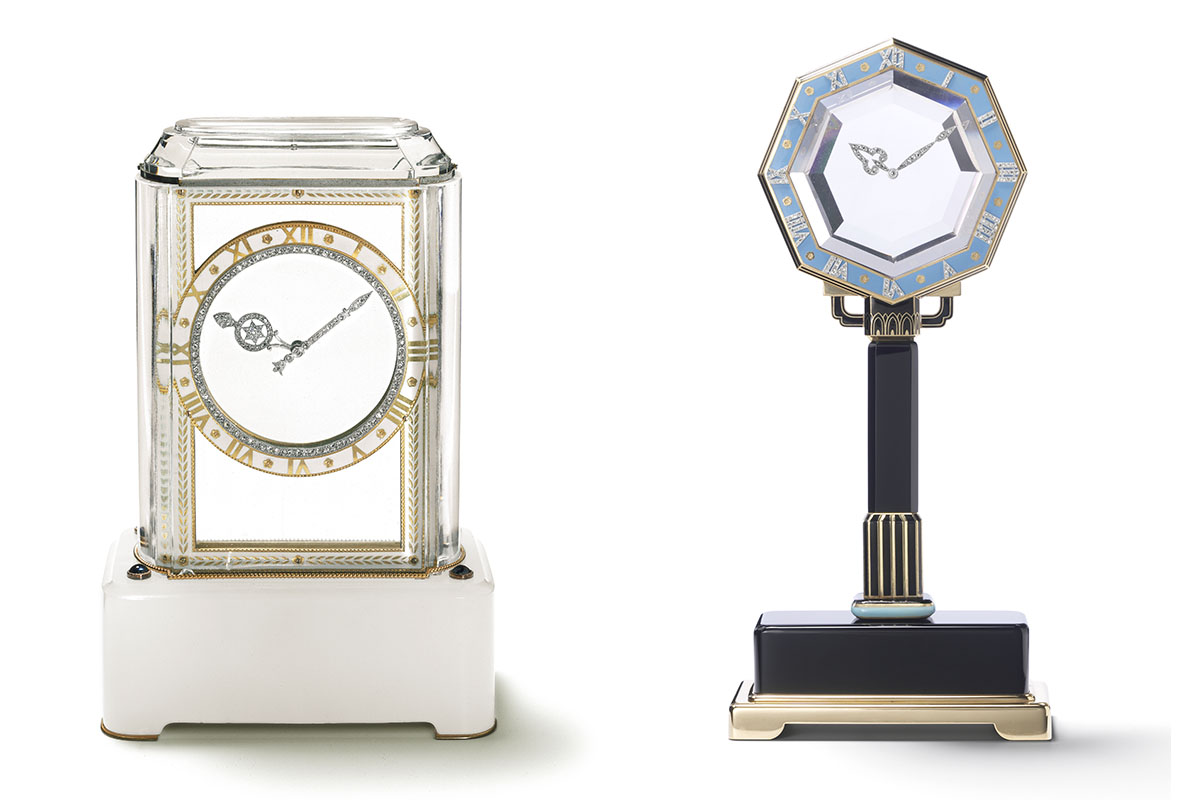 Anche in questi casi, le lancette – spesso in platino e diamanti – non sembrano collegate ad alcun ingranaggio, ma danno l’impressione di fluttuare nel corpo trasparente della pendola. In realtà ciascuna di esse è fissata a un disco di cristallo di rocca dal bordo dentato, a sua volta trascinato da un ruotismo collegato al movimento mediante un asse verticale.