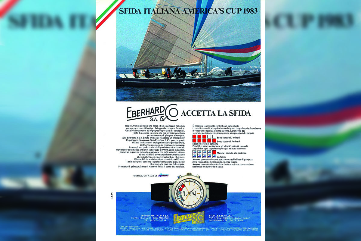 Proprio nel 1983, Eberhard & Co. divenne anche l’orologio ufficiale di Azzurra. Il primo 12 metri Stazza Internazionale della storia del nostro Paese, che sotto il guidone dello Yacht Club Costa Smeralda accettò la sfida dell’America’s Cup – come declamava una pubblicità dell’epoca. La barca non riuscì a conquistare l’Old Mug, ma ingaggiò indimenticabili regate, fece sognare mezza Italia e avvicinò gli Italiani alla vela. Ed Eberhard fu primo attore in quell’avventura: a Cino Ricci, Mauro Pelaschier e agli altri nel pozzetto dedicò un orologio con funzione regata, chiamato proprio Azzurra.