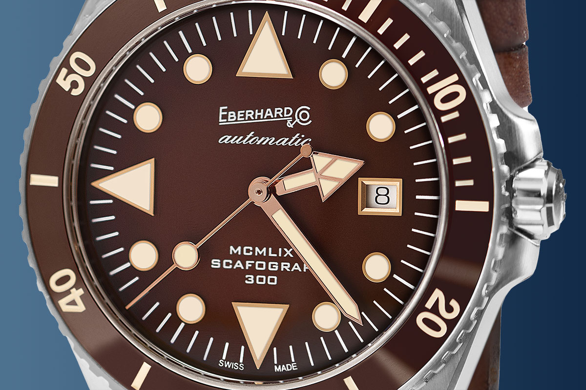 Gli stessi parametri ritornano anche nella versione del 2019: un’edizione celebrativa che prende nome proprio dai numeri romani riportati sul quadrante, chiaro riferimento alla nascita dell’orologio e ai suoi 60 anni di storia. Lo Scafograf 300 MCMLIX in prima battuta esce con un tradizionale total look nero, ma in seguito genera appunto ulteriori varianti: blu nel 2021 e verde nel 2022. Cui si aggiunge ora l’esemplare in una calda tonalità cioccolato. Le differenze cromatiche comunque non modificano i punti di forza estetici dell’orologio: gli indici triangolari sovradimensionati al 12, 6 e 9, intervallati ai tradizionali “bicchierini”, e le lancette a freccia, a bastone, lollipop, con abbondante materiale luminescente color seppia a rivestire le indicazioni. Il tutto a comporre un irresistibile aspetto neo-rétro, che ha riscosso grande apprezzamento.