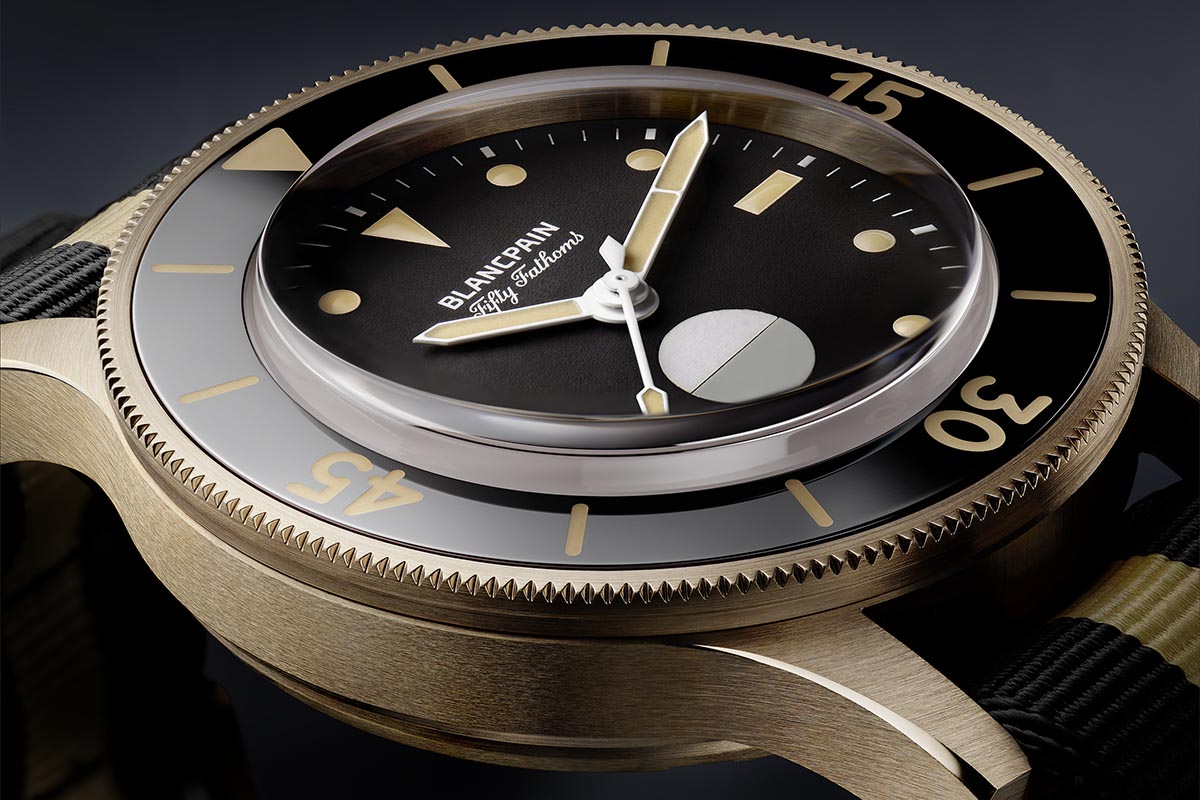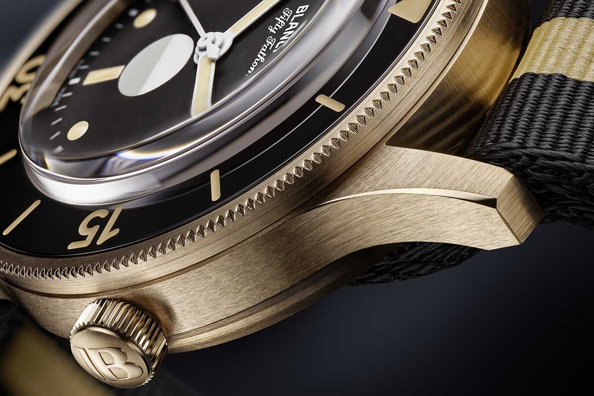 Quello che invece distingue il Blancpain Fifty Fathoms 70th Anniversary Act 3 dall’orologio del passato è sicuramente la lunghezza delle anse, che là erano più corte e avvolgenti, oltre al materiale della cassa. L’ho anticipato prima, si tratta di bronzo dorato e, come promesso, ora ne parlo un po’ più da vicino.