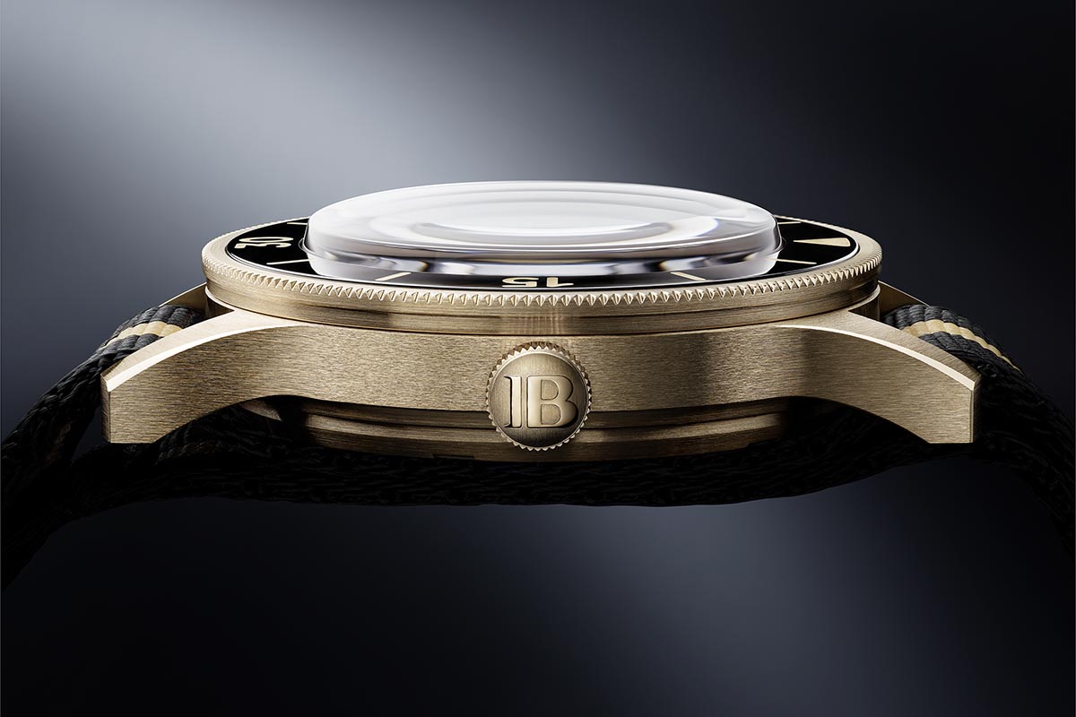 Questo ha consentito di evitare l’inserimento di una gabbia in ferro dolce a protezione del calibro, come si faceva un tempo, e di rendere così il movimento visibile attraverso il fondello in vetro zaffiro. L’anello di incassaggio è anch’esso in bronzo dorato; dettaglio non secondario, perché negli orologi con cassa in bronzo di solito il fondello è in un altro metallo perché la lega può generare reazioni allergiche sulla pelle del polso.