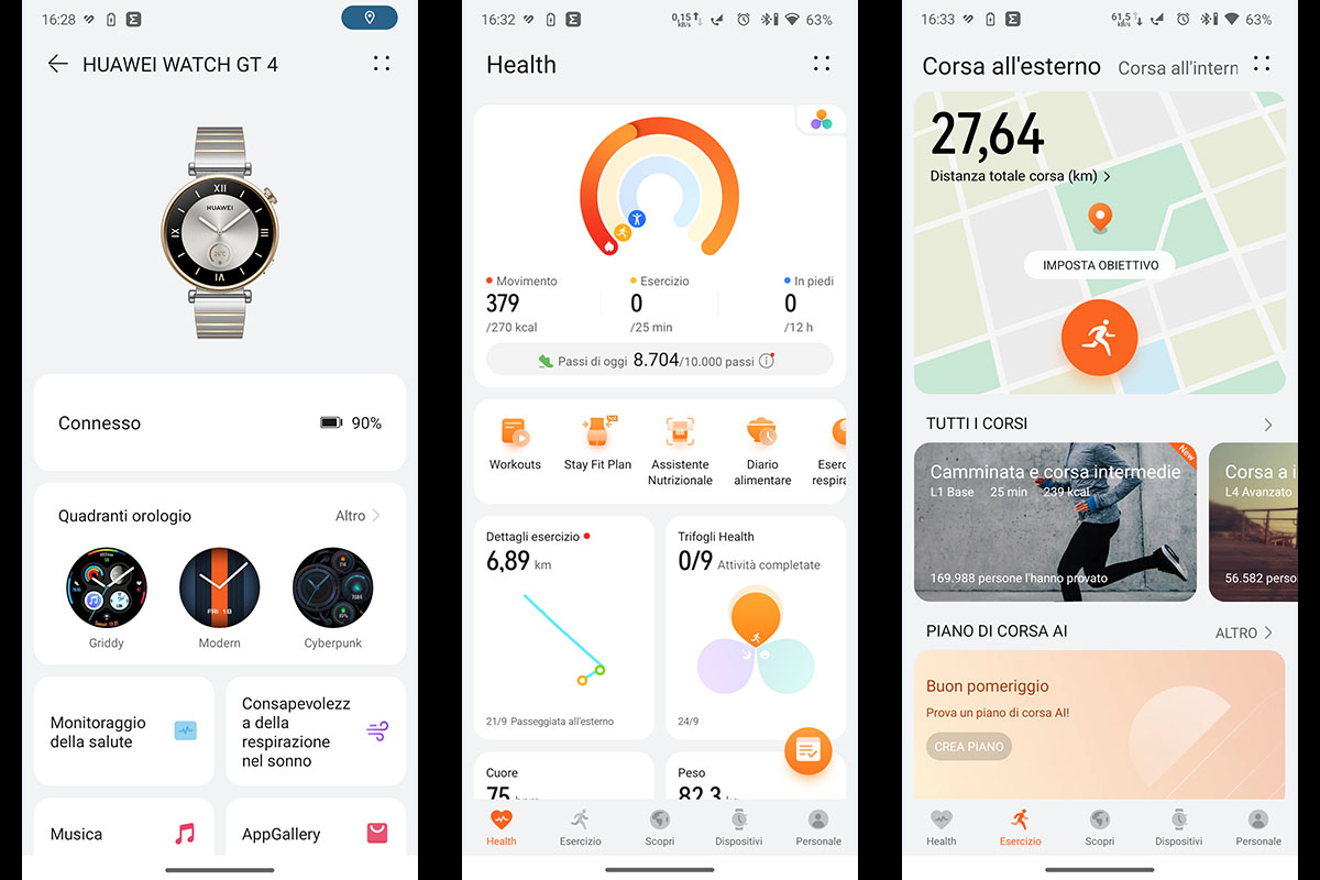 Il Watch GT 4 è il primo sportwatch di Huawei dotato di Harmony OS 4 che ho avuto il piacere di provare. Si tratta della nuova major release del sistema operativo per dispositivi da polso messa a punto dal colosso cinese. Presenta un’interfaccia più semplice e intuitiva, oltre a diverse nuove opzioni di personalizzazione. Chi ha già utilizzato uno smartwatch Huawei in passato, tuttavia, non avrà difficoltà ad adattarsi al nuovo ambiente, che mantiene la stessa logica e la stessa estetica.
