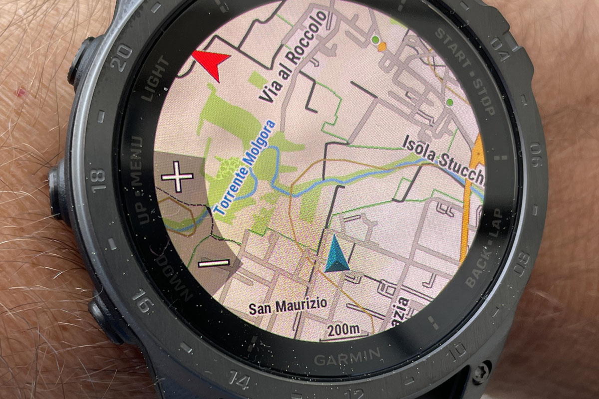 Visto che in Garmin sottolineano molto la facilità di utilizzo anche con scarsa illuminazione, l’ho provato anche di sera. Confermo che l’intensità regolabile della luminosità del display è molto comoda. Il Garmin Tactix 7 Amoled Edition ha infatti il cosiddetto Red Shift mode, che ne modifica l’interfaccia virando in sfumature di rosso che aiutano la visione notturna. Ridurre l’illuminazione durante le ore di riposo, va anche a vantaggio della durata della batteria.