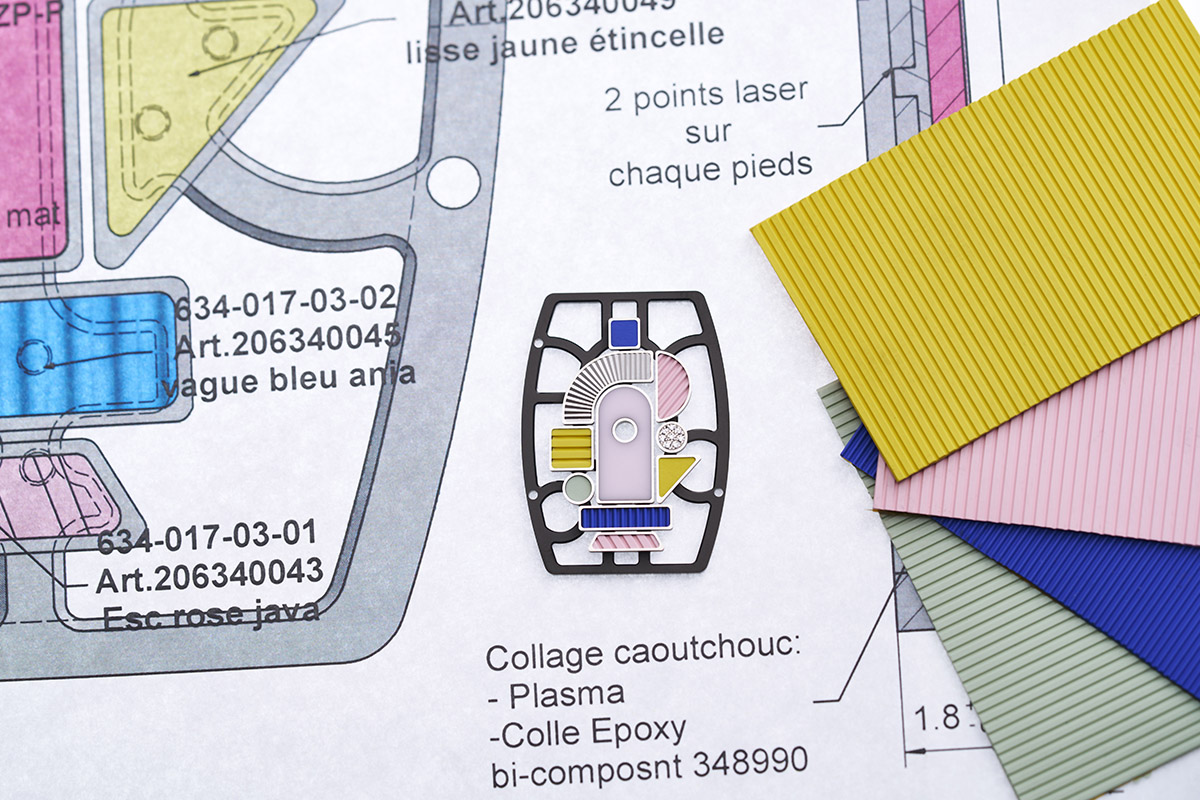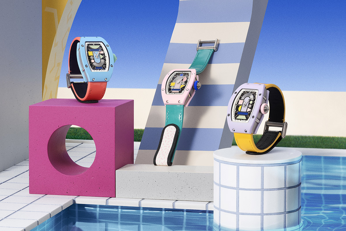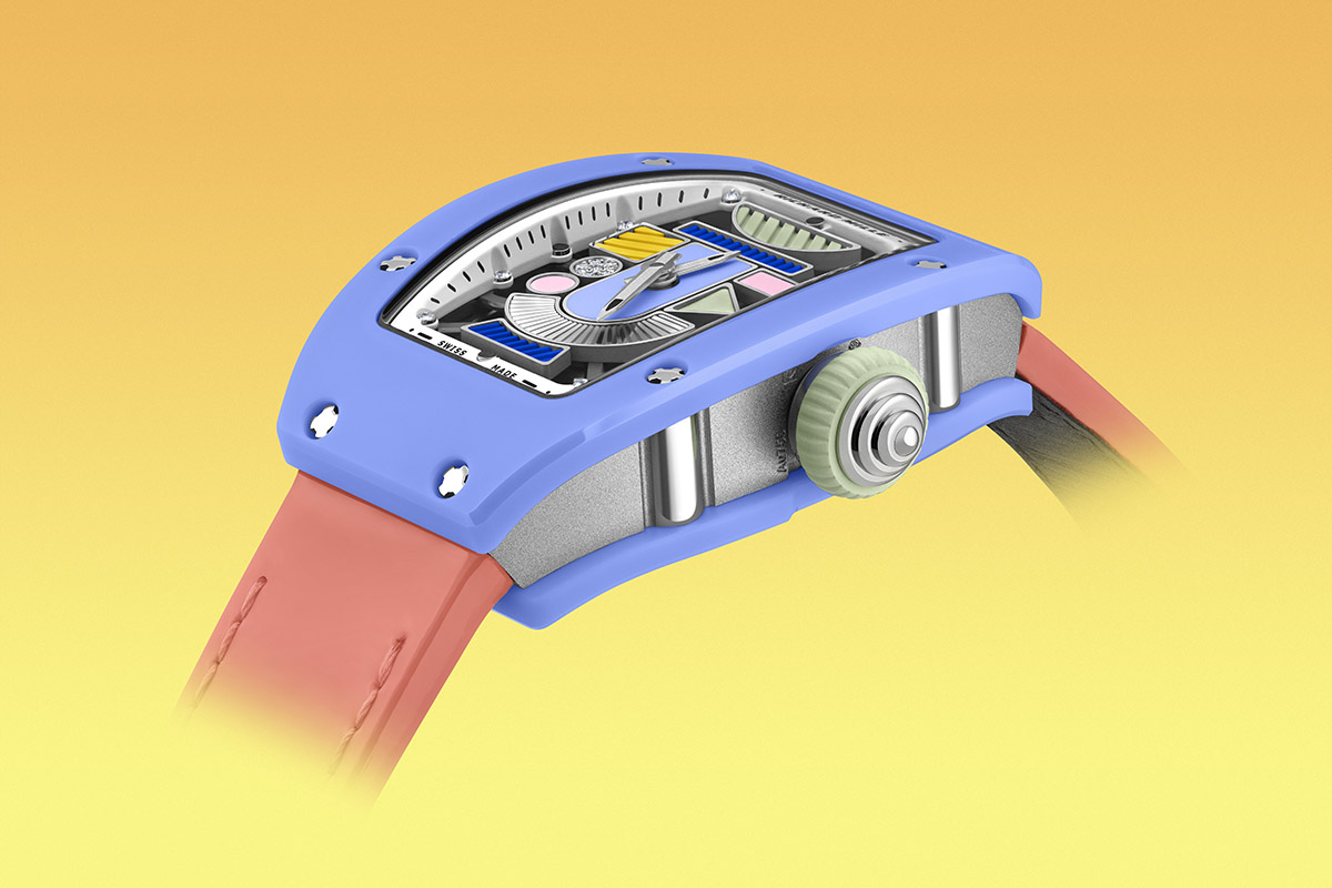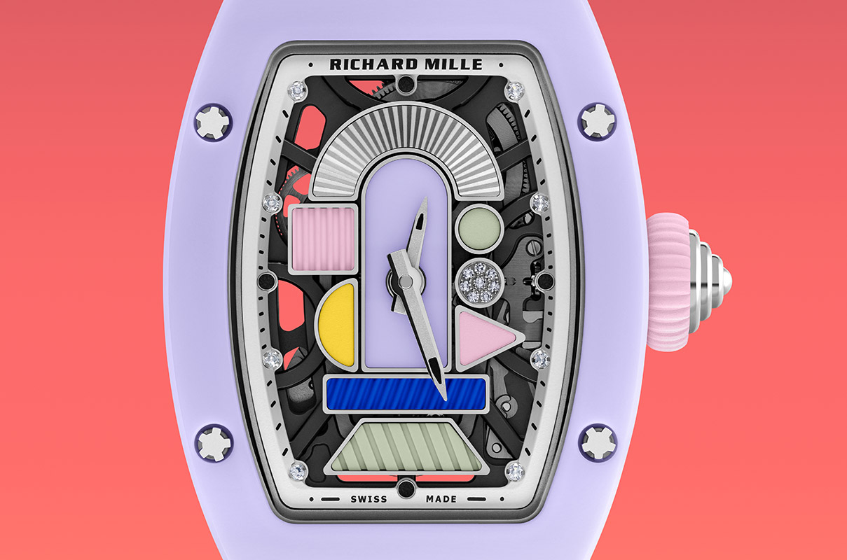 Forme geometriche e cromie accese, del resto, si ritrovano anche nei nuovi esemplari dell’RM 07-01 Ceramiche Colorate: seguito ideale della collezione lanciata nell’estate 2021 ma sviluppata in un modo del tutto nuovo. Il quadrante ora è formato da molti più elementi geometrici: rettangoli, triangoli, quadrati, semicerchi… Posati su una struttura in oro rosso Pvd grigio, sono realizzati con materiali, sfumature e decori diversi, accostati l’uno all’altro in totale libertà. Frammenti di ceramica, gomma, oro sono satinati, laserati, lavorati a guilloché o tempestati di microscopici diamanti. Saturi di colori pastosi – a volte elettrici o vitaminici, altre tenui e delicati -, creano composizioni rigorose ma fantasiose allo stesso tempo. Ispirate proprio al Gruppo milanese di Sottsass, De Lucchi, Cibic & Co.