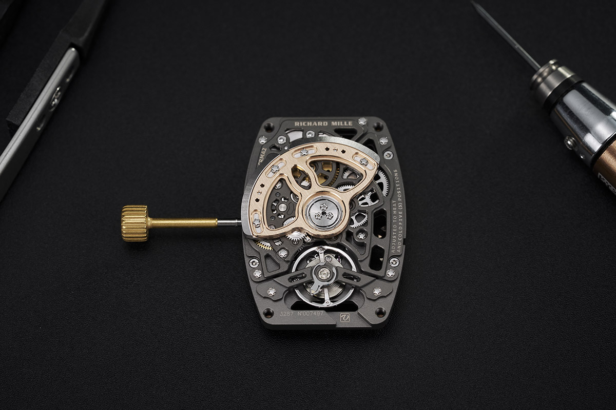 Concludo con la descrizione del movimento, non perché sia meno importante ma perché si tratta del consueto calibro Crma2. A carica automatica, dalla costruzione scheletrata, presenta tutte le caratteristiche meccaniche cui Richard Mille ci ha ormai abituati (e che ormai diamo quasi scontate nei suoi esemplari). Tuttavia, se le si analizza nel dettaglio, ci fanno comprendere il contenuto tecnico elevatissimo raggiunto dai movimenti della Maison, risultato di studi curati, di specifiche competenze e di fornitori di qualità.