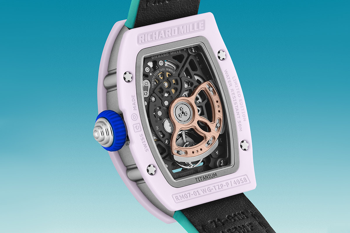 A cominciare dal materiale di cui sono fatti platina e ponti: titanio grado 5, una lega leggera, robusta e che conferisce la rigidità necessaria al buon funzionamento di tutti gli ingranaggi. Oppure il bariletto a rotazione rapida, che garantisce prestazioni migliori anche in funzione della costanza di marcia. O ancora il rotore a geometria variabile, che si può regolare in relazione all’attività fisica di chi indossa l’orologio. Tutte cose che alla fine rendono l’RM 07-01 Ceramiche Colorate super-affidabile, che lo si usi in vacanza o nella routine quotidiana. Perché se anche l’estate ha una fine, un orologio può migliorarci un po’ la vita. E in questo caso anche farci sognare…