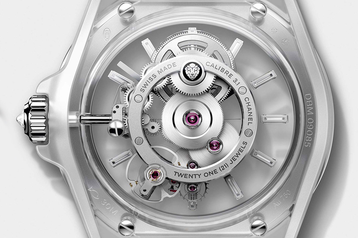 Come nel J12 X-Ray, il Calibro 3.1 – concepito e realizzato “in casa” – non solo ha una costruzione interamente scheletrata, ma anche la platina e i ponti in vetro zaffiro. Il risultato è un’architettura leggerissima, dall’aspetto arioso, perfino rarefatto. Sembra quasi essere sospeso nel nulla, con la luce che ne attraversa i diversi componenti meccanici. Una nota personale: a Ginevra non ho potuto toccarlo né indossarlo, ma anche solo vederlo dal vivo – devo dire la verità – è quasi emozionante.
