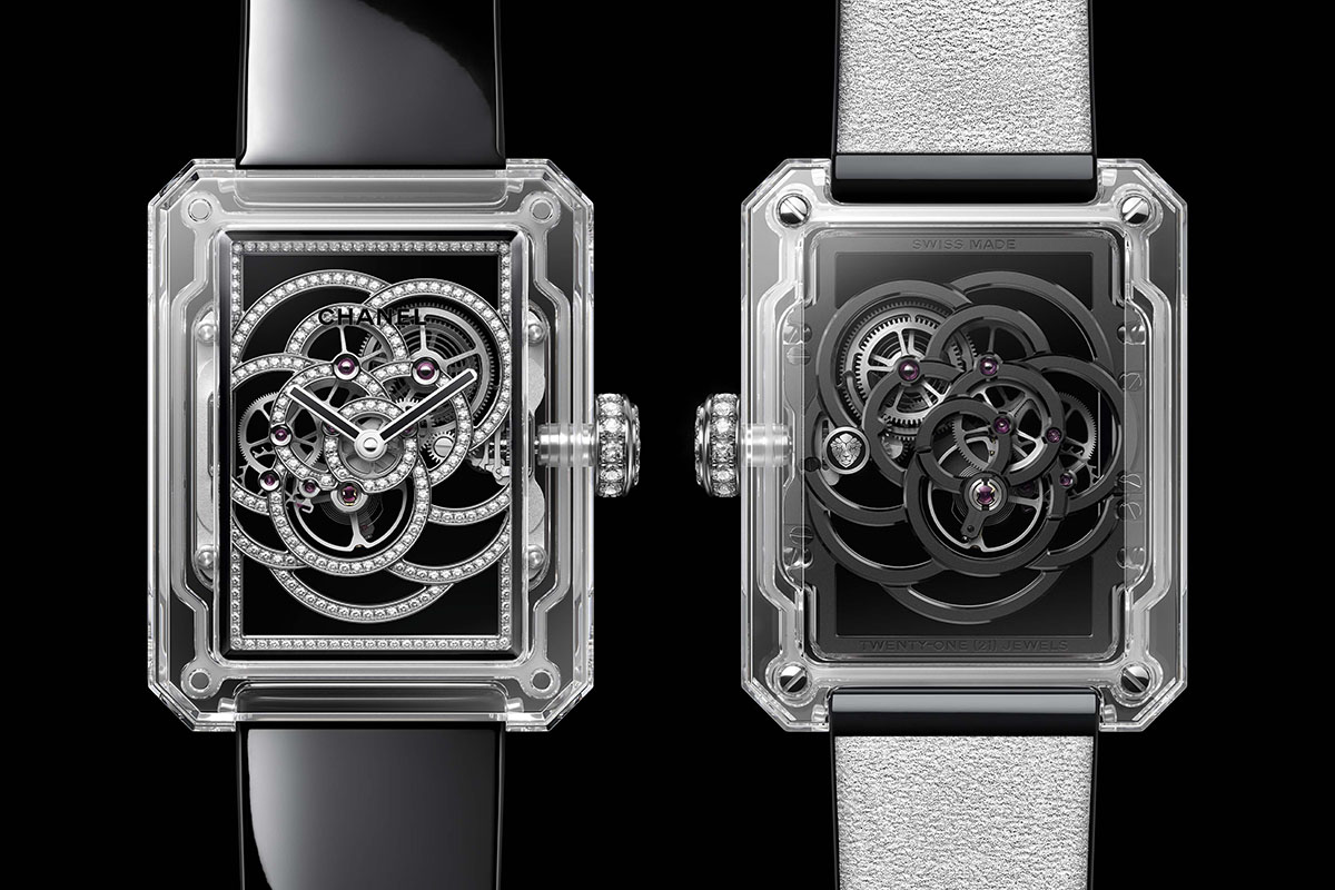 Anche qui, da citare almeno il movimento. A carica manuale e sempre di manifattura, è il Calibro 2. Un unicum nell’intero settore per la silhouette dalla forma floreale – anzi, per essere precisi, a camelia, il fiore prediletto da Mademoiselle Coco. Una camelia stilizzata, simile ad alcuni pezzi di gioielleria dell’omonima collezione: una similitudine accentuata dal fatto che i ponti sono incastonati da piccoli diamanti taglio brillante.