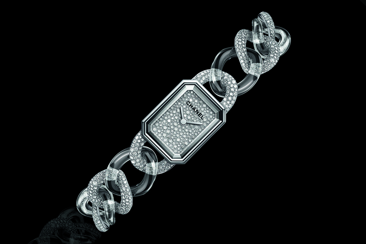 Terzo e ultimo modello della serie, il Première X-Ray mantiene la foggia e il formato dell’esemplare originario, così come il movimento al quarzo Swiss made. Ma si differenzia per l’inedito bracciale a catena gourmette, formato da anelli in vetro zaffiro alternati ad altri in oro bianco tempestati di diamanti. Un bracciale siffatto, un’assoluta novità in orologeria, ha richiesto la messa a punto di un particolare procedimento di costruzione.