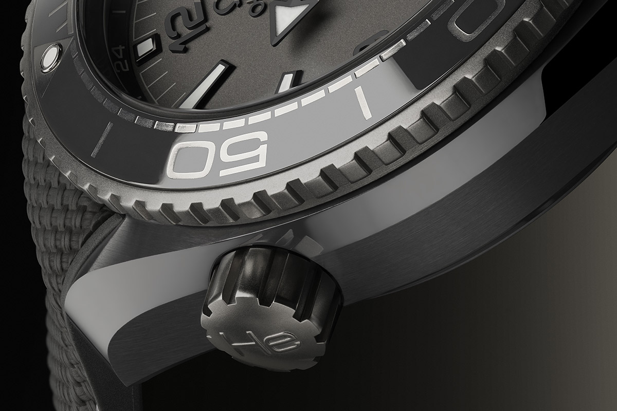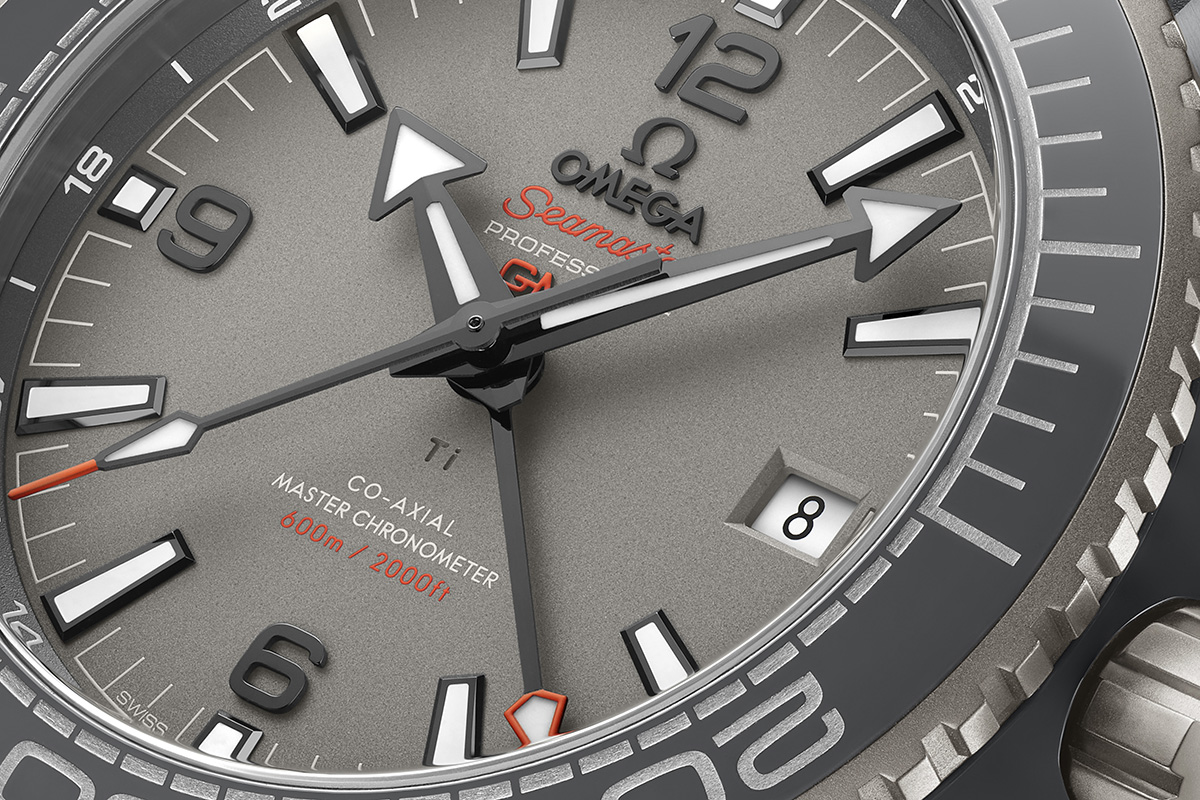 Proprio per non appesantire la struttura e continuare a giocare con la leggerezza, Omega ha realizzato il quadrante in titanio grado 5 dalla finitura sabbiata. (Non mi soffermo volutamente su questa lega molto diffusa in orologeria e di cui ci siamo già più volte occupati). E sempre in titanio grado 5 sono anche la lunetta girevole unidirezionale, la corona e la valvola di decompressione. L’inserto della ghiera è invece in ceramica al nitruro di silicio, così come il fondello, serrato con il sistema di chiusura (brevettata) Naiad Lock. Fronte e retro sono ovviamente protetti da vetro zaffiro, anch’esso leggero ma molto resistente. Grazie alla presenza di questi componenti, il peso totale della cassa è di 107 grammi, movimento compreso.