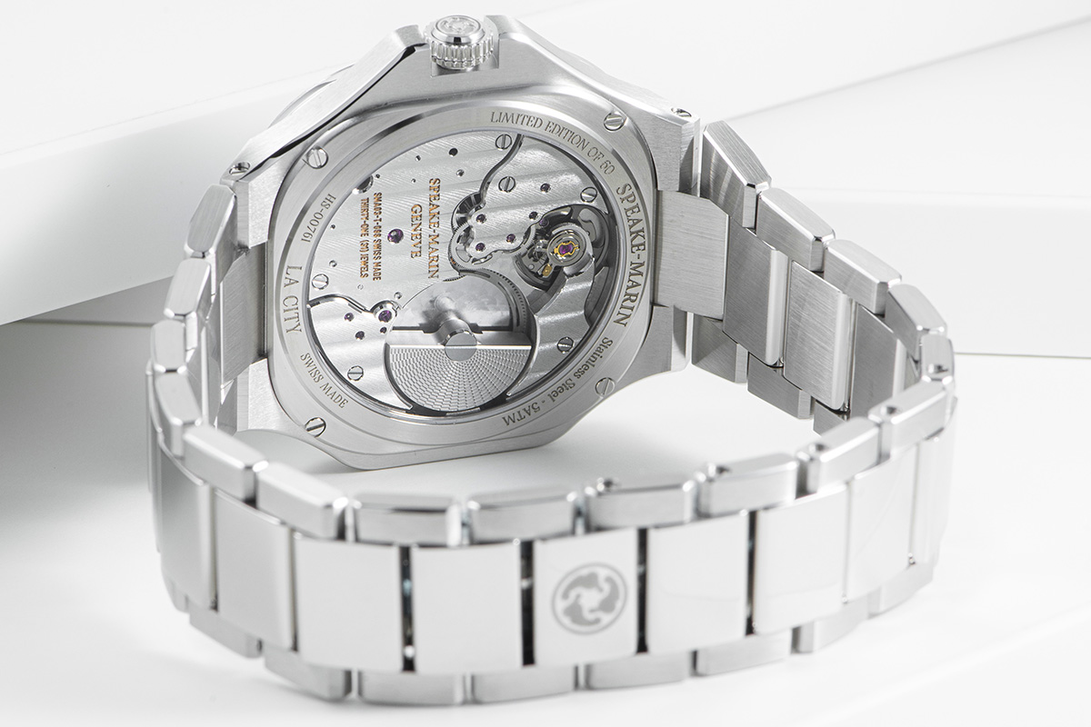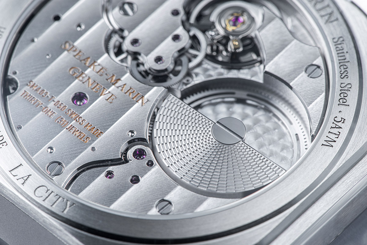 Parlando, quindi, di meccanica, passiamo al cuore pulsante del Ripples Metallic Green. Ovvero il calibro SMA03-T, concepito e sviluppato “in casa”, presso Le Cercle des Horlogers, laboratorio svizzero di proprietà situato a La Chaux-de-Fonds. Un movimento a carica automatica, con micro-rotore in tungsteno e dalla decorazione esclusiva: i ponti sono rodiati e rifiniti a Côtes de Genève, bordi e angoli interni sono smussati e lucidati a mano.