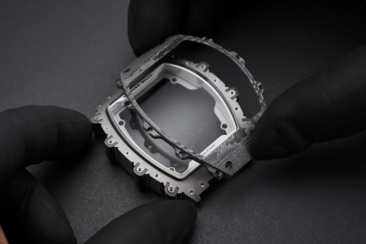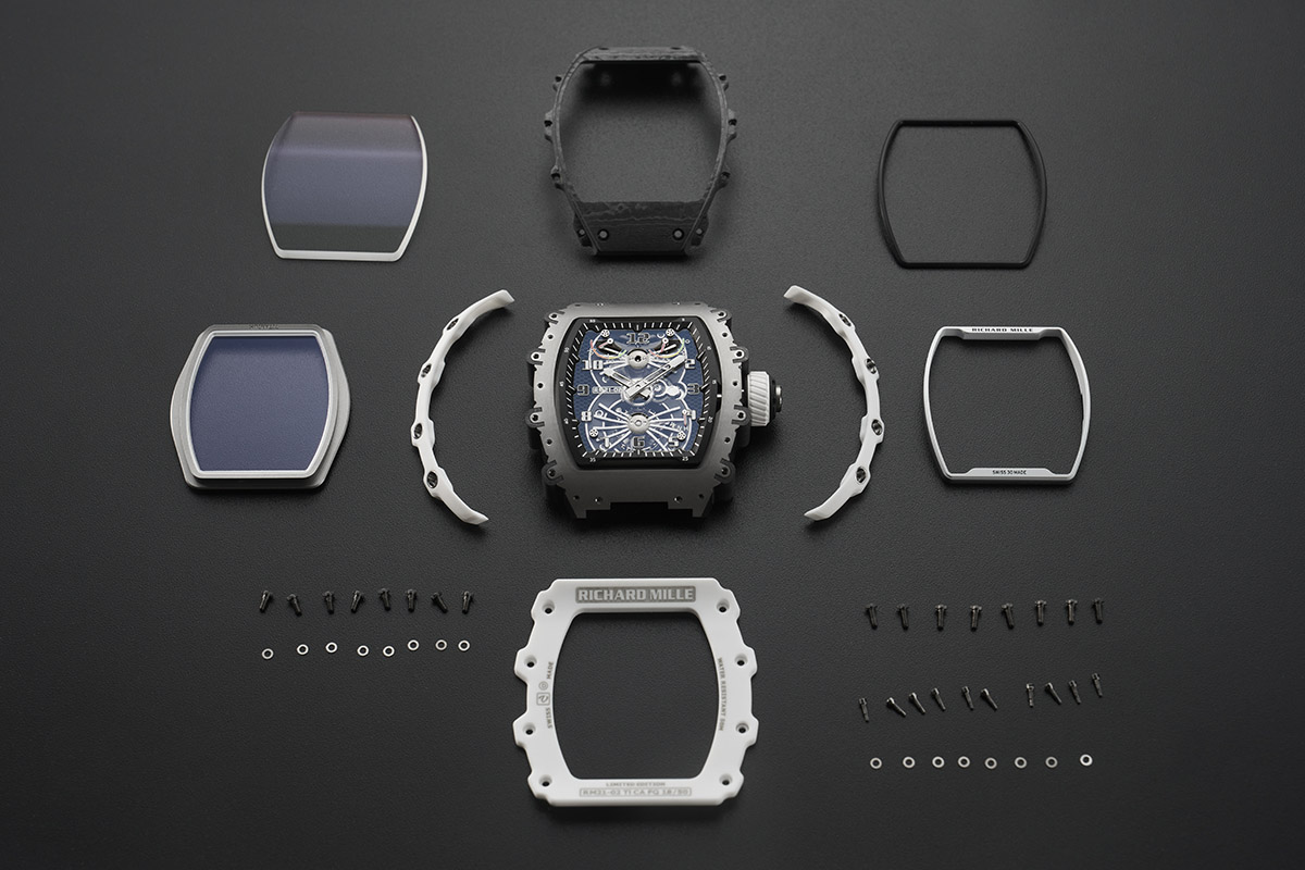 Quarzo Tpt e carbonio Tpt (l’acronimo sta per “tecnologia a strati sottili”) sono dei compositi laminati prodotti da un’azienda svizzera specializzata, la North Thin Ply Technology, che ha sede fuori Losanna e con cui Richard Mille collabora da anni. Il titanio grado 5 è una lega utilizzata in modo diffuso in orologeria. Il Giornale degli Orologi se n’è già occupato più volte, quindi evito di ripetere quanto già scritto sui loro processi di fabbricazione e proprietà varie.