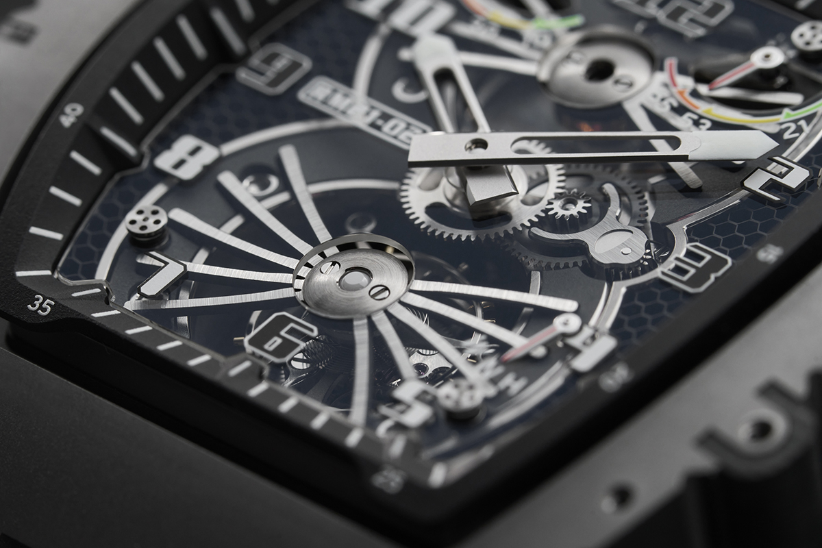 Riguardo alle funzionalità, due display ad arco in posizione simmetrica sulla parte alta del quadrante mostrano appunto l’indicazione dell’autonomia di 70 ore e quella della coppia. Quest’ultima permette di conoscere la tensione della molla del bariletto, visualizzata su una scala da 1 a 12 e misurata in Newton millimetri (Nmm). Come spiegano da Richard Mille, al di sotto di 5,3 Nmm la tensione della molla è troppo debole; sopra i 6,5 Nmm è eccessiva. Dato che coppia e autonomia residua influiscono sulla costanza di marcia e quindi sulle prestazioni cronometriche dell’orologio, lo scopo di queste indicazioni è aiutare il possessore a farlo funzionare in modo ottimale.