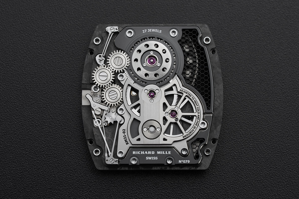 Già, il calibro: si tratta dell’RM 021, ormai ben conosciuto ma non per questo meno straordinario. A carica manuale, è fornito di tourbillon a un minuto, indicazione dell’autonomia residua, indicazione della coppia e selettore di funzione. Ma prima di spiegarne le funzioni, devo raccontare come è fatto. E non mi riferisco alle consuete raffinatezze tecniche cui Richard Mille ci ha ormai abituati. Oltre ai ponti in titanio grado 5, al bilanciere a inerzia variabile, al bariletto a rotazione rapida, al profilo a evolvente della dentatura del bariletto, c’è di più.