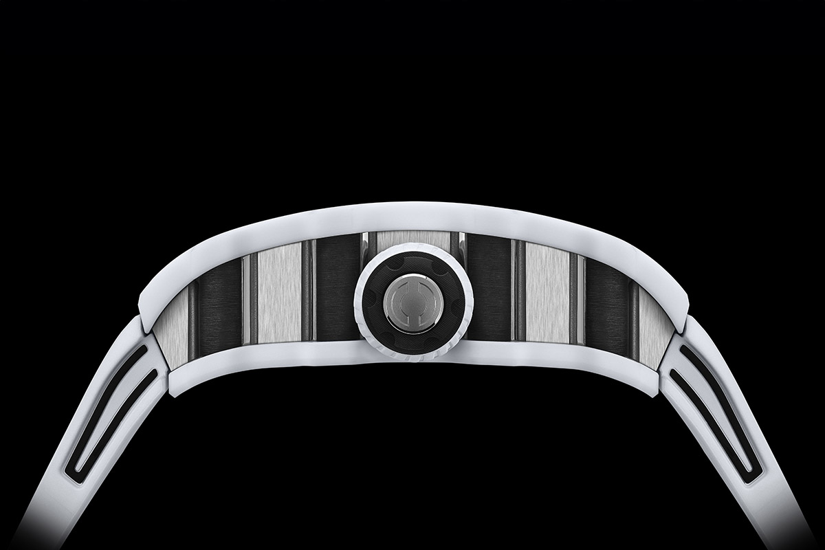 Preferisco invece spostare l’attenzione sull’architettura composita della cassa, forse una delle più complesse di tutto il catalogo Richard Mille. La struttura di base è infatti in titanio grado 5 satinato (con tutto quello che la cosa comporta), ed è rivestita non da una semplice lunetta ma da un’altra struttura in carbonio Tpt nero, a sua volta circondata da due segmenti ad arco, come due parentesi, in quarzo Tpt bianco.