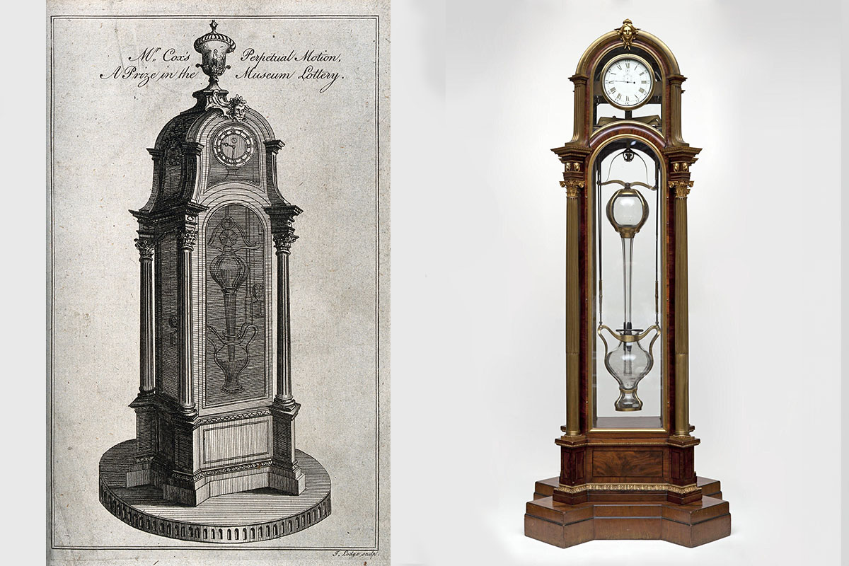 Nel suo atelier, per esempio, realizzò poco dopo il 1760 uno splendido orologio domestico “senza carica”, presentato da Cox stesso come «dotato di moto perpetuo». In effetti la carica era fornita dalle variazioni di pressione atmosferica della stanza in cui era collocato (un po’ come un’Atmos ante litteram, per intenderci). Oggi conservato al Victoria and Albert Museum di Londra, fu il risultato della collaborazione di James Cox e Jean-Joseph Merlin, suo braccio destro anche nella progettazione e costruzione degli automi che lo resero famoso presso le corti reali. A titolo di curiosità, Merlin – nato in Belgio ma inglese d’adozione – era anche molto noto per il senso dell’umorismo, che lo portava spesso a fare scherzi. Poliedrico ingegno, a lui si deve anche l’invenzione dei pattini a rotelle.