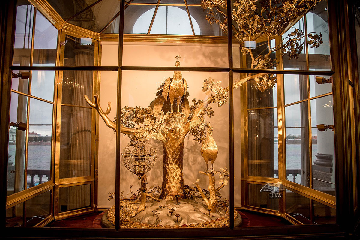 Tra tutti, la più importante – per dimensioni e importanza – è sicuramente l’orologio del Pavone, una grande voliera animata oggi visibile all’Ermitage di San Pietroburgo. Acquistata su suggerimento del principe Grigory Potiomkin nel 1781 da Caterina la Grande, Imperatrice di Russia, fu inviata smontata e riassemblata localmente. Ospita appunto un pavone a grandezza naturale che a ogni ora prende vita ed esibisce una magnifica ruota piumata. Oltre al pavone, è popolata da una civetta e un gallo, anch’essi dotati di movimenti realistici, ed è ricca di elementi vegetali in cui si trovano scoiattoli, libellule, lumache. L’orologio motore dell’insieme aziona anche suonerie ed effetti musicali. Tuttora è messo in funzione ogni giorno, per la gioia dei visitatori.