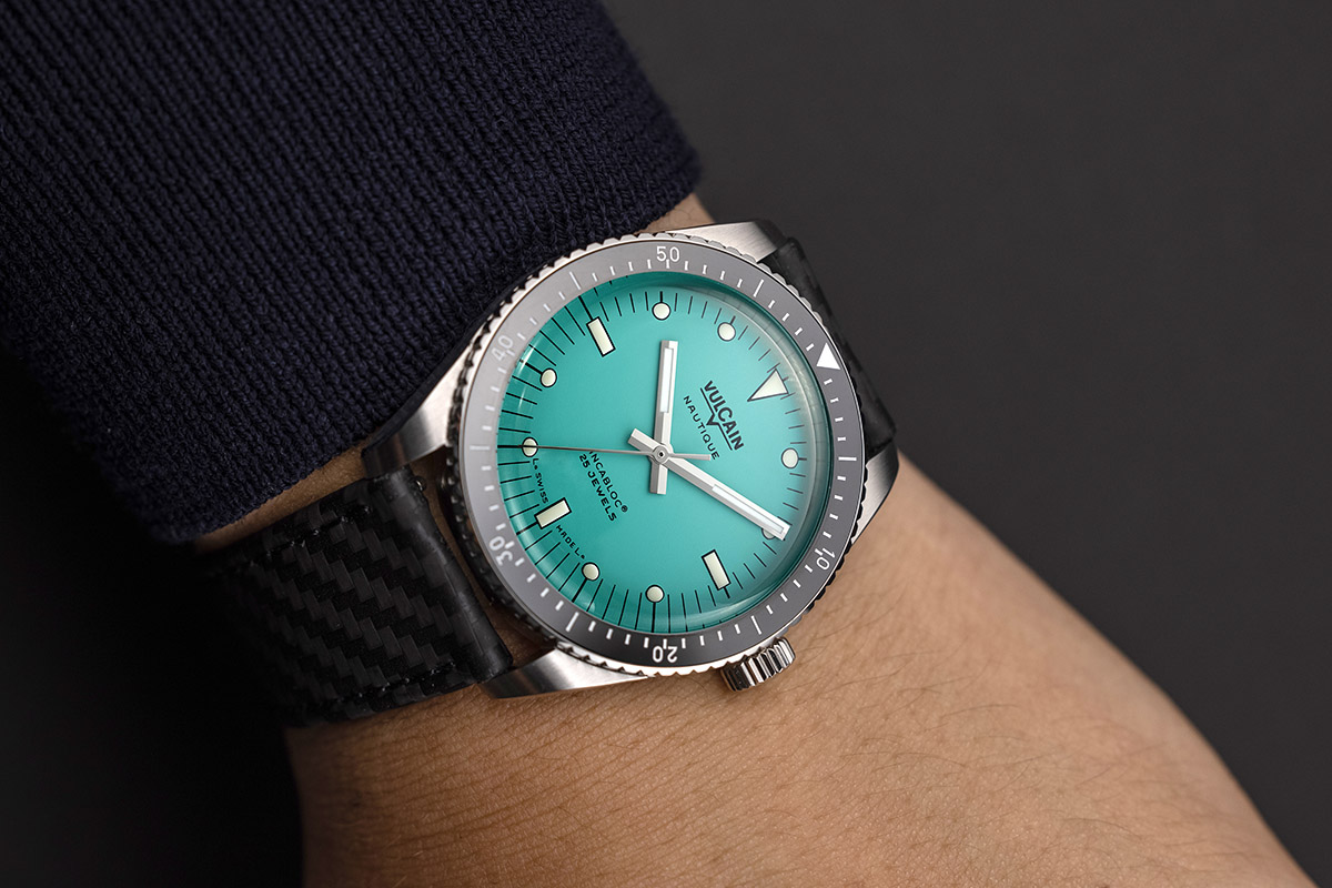 Cassa (38,3 mm) in acciaio 316L, impermeabile fino a 20 bar. Movimento meccanico a carica automatica, calibro Eta 2824. Quadrante bombato, lancette e indici luminescenti, lunetta girevole unidirezionale con inserto in ceramica, vetro zaffiro bombato, cinturino in pelle effetto carbonio. Edizione limitata di 50 esemplari, 1.500 euro. In consegna a febbraio.