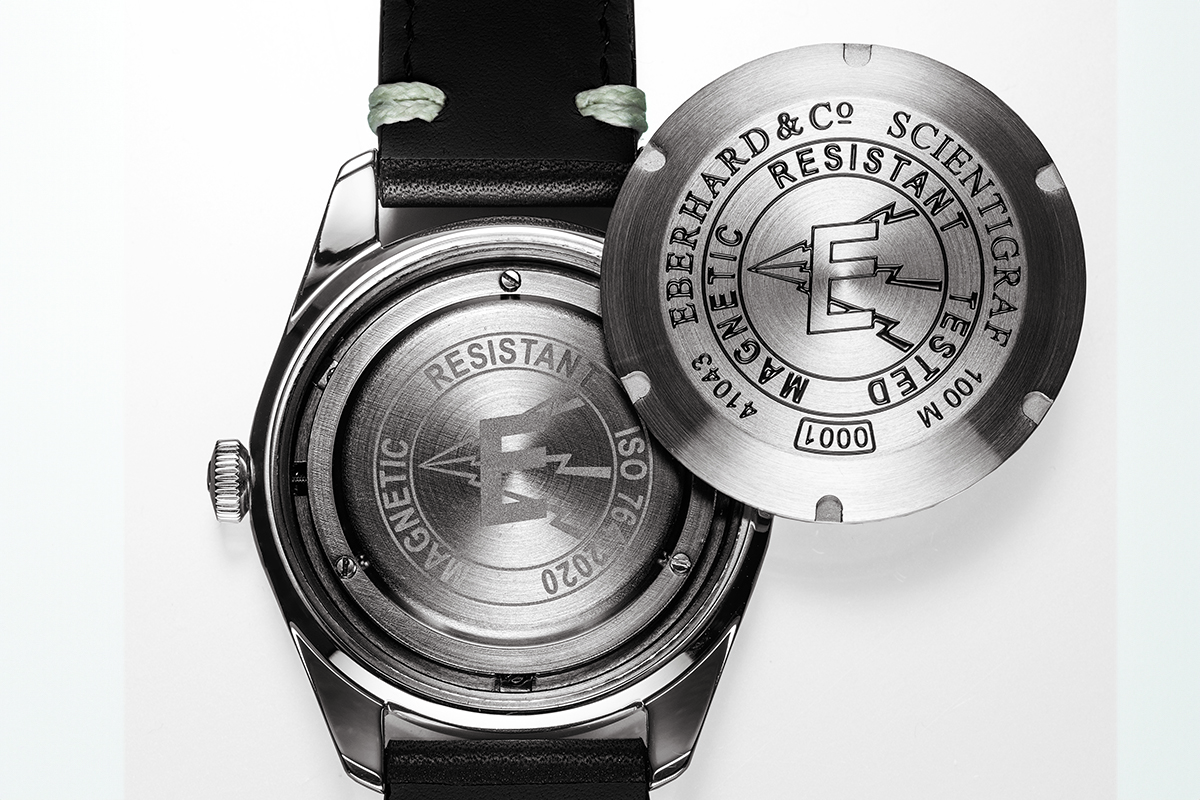 Concludo con qualche altro dettaglio. Il fondello “chiuso”, dicevo, è personalizzato da un’incisione che evoca i campi magnetici, realizzata per il primo esemplare del 1961 e ricorrente in quelli successivi, decorato al centro con la E di Eberhard. In più riporta la scritta “Tested magnetic resistant” a sottolineare la resistenza ai campi magnetici fino a 4800 ampère/metro, secondo la norma ISO 764 2020.