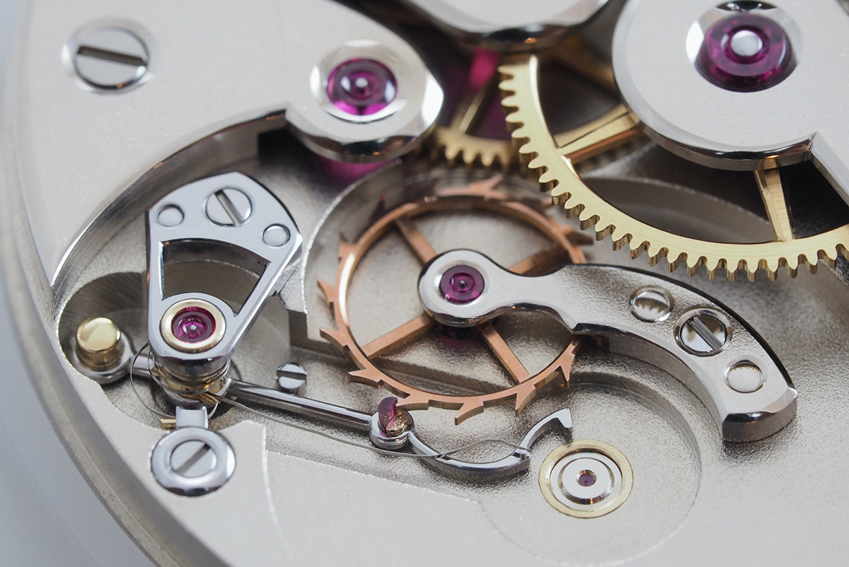 Nell’orologio di Raúl Pagès, la scelta dell’affissione a regolatore la dice lunga sull’importanza che lo stesso Pagés attribuisce alla cronometria e quindi alla costanza di marcia. A questo stesso obiettivo rimanda anche lo scappamento à détente, cuore del movimento meccanico a carica manuale da lui interamente progettato, costruito e assemblato (a mano). Un dispositivo non comune, negli orologi da polso, e che merita una spiegazione. Provo dunque a descriverne le caratteristiche, confrontandole con quelle del consueto scappamento ad àncora. Non me ne vogliano i puristi, ma dovrò cercare di semplificare.