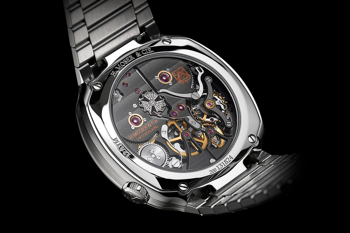 Per la cronaca, il calibro HMC 812 è dotato di spirale Straumann, nata dalla collaborazione tra Moser e la controllata Precision Engineering AG, erede dell’Institut Straumann AG. Senza entrare in tecnicismi, questa spirale migliora la precisione del movimento. È chiamata così in omaggio al prof. Reinhard Straumann, che all’inizio degli anni ’30 brevettò il Nivarox e le relative tecnologie di produzione.