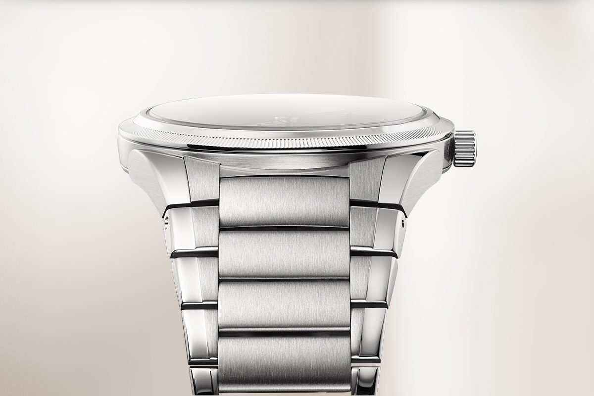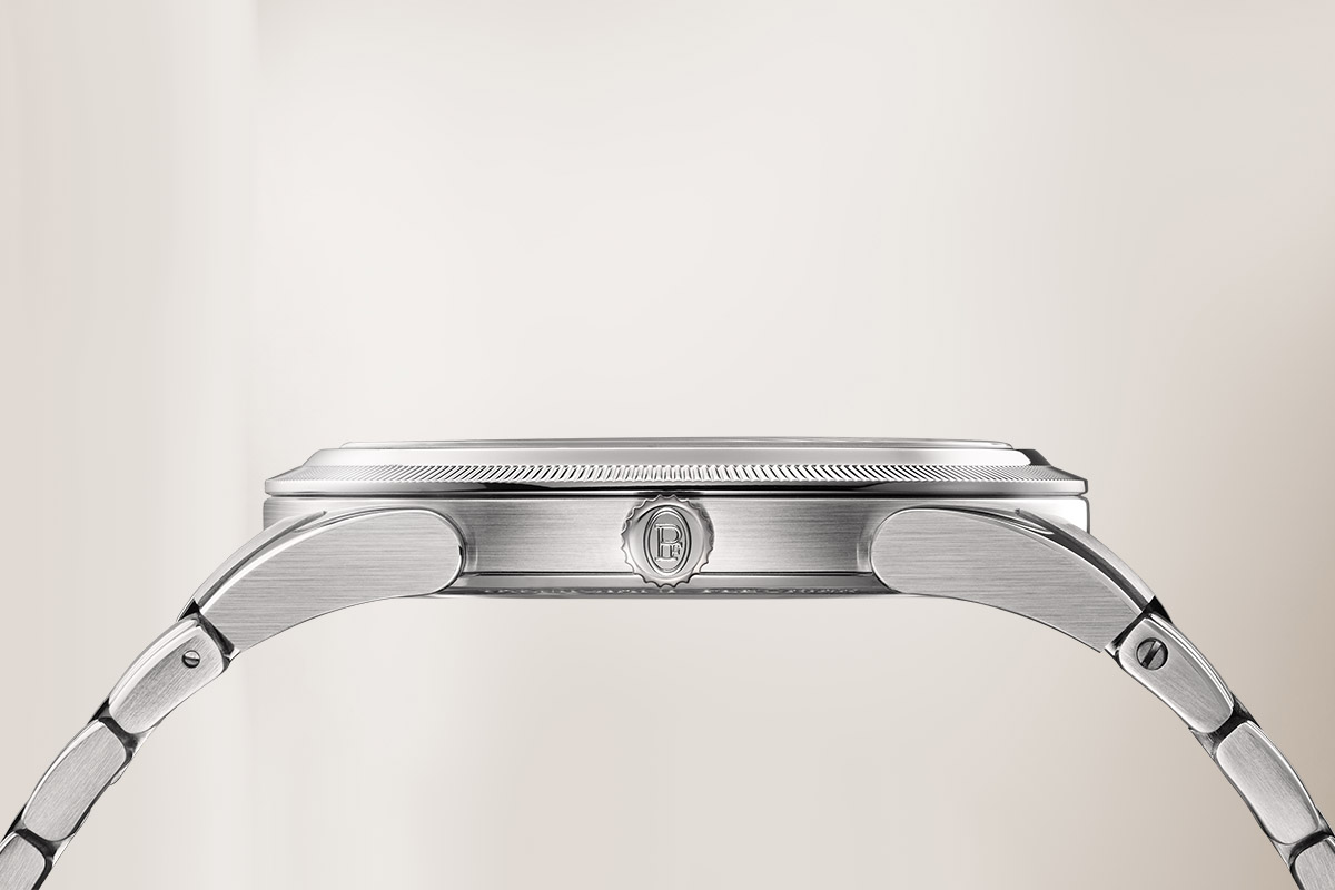 Per entrare nel concreto, la costruzione, ormai nota dagli estimatori della Casa, rimanda ai canoni della collezione. Cassa e bracciale, dalla linea tesa ed essenziale, sono in acciaio inossidabile. L’una ha un diametro di 40 mm e uno spessore limitato di 7,8 mm, è impreziosita dalla ghiera zigrinata in platino e alterna superfici lucide e satinate. L’altro, giocato sulla medesima alternanza di finiture, non solo si raccorda in modo perfetto alla carrure all’interno delle tipiche anse a goccia, ma è anche rastremato, così da risultare più confortevole al polso.