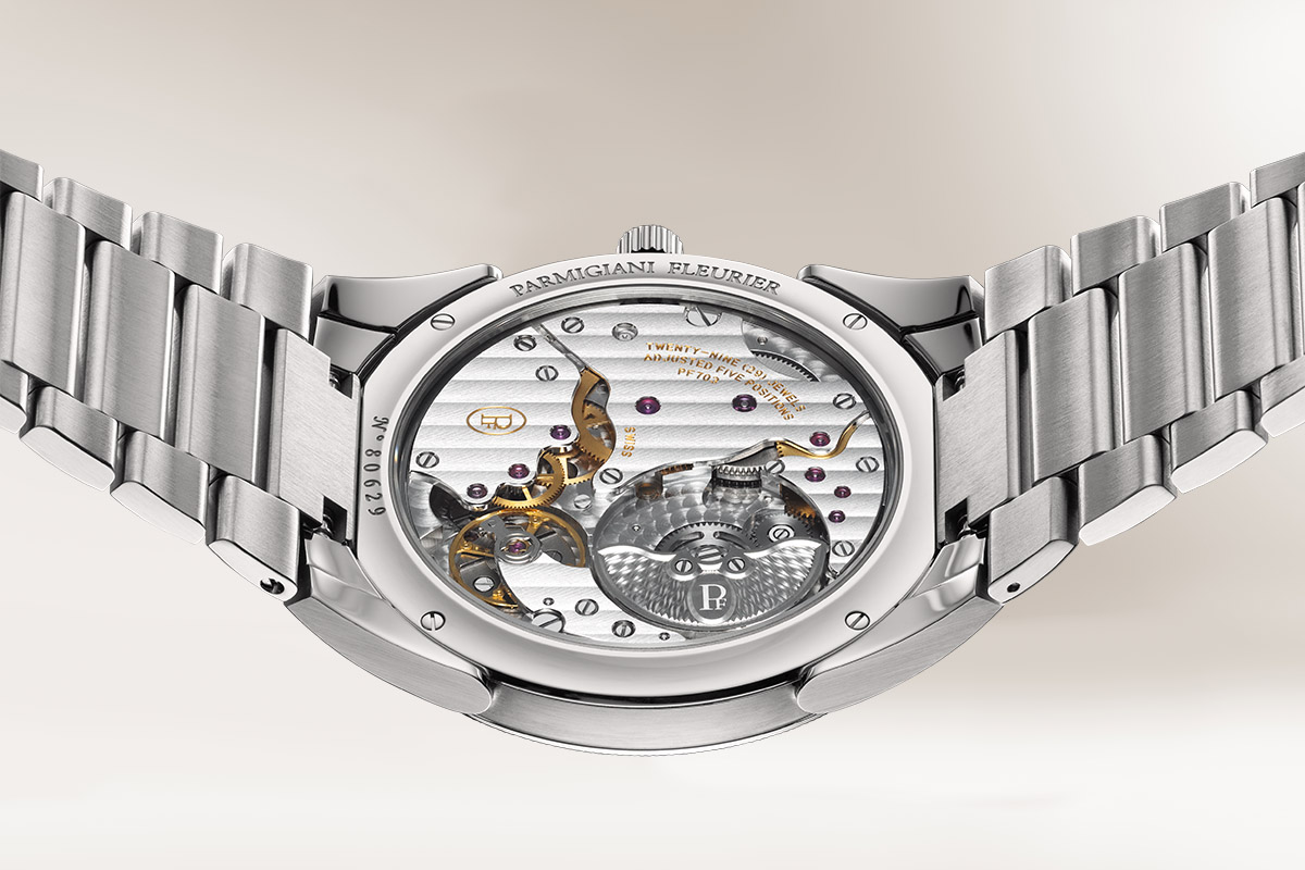 Ed è proprio il fondello in vetro zaffiro a mostrare il movimento, il cuore del Tonda Micro-Rotor No Date. Ovviamente di manifattura, il calibro PF 703 si distingue per il dispositivo di carica automatica da cui l’orologio prende nome. Il micro-rotore decentrato è in platino, un metallo pesante che assicura la corretta inerzia e l’efficienza della ricarica. Anch’esso lavorato a Grain d’orge con estrema cura, e personalizzato dal logo, è perfettamente integrato all’interno dei ponti e permette quindi di contenere lo spessore complessivo.