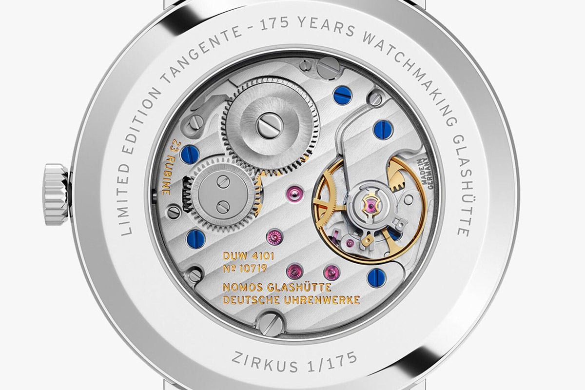 Il calibro DUW 4101 lavora a 21.600 alternanze/ora, offre 42 ore di autonomia ed è dotato del cosiddetto fermo macchina: estraendo la corona per regolare l’ora, si fermano anche i piccoli secondi. È regolato in sei posizioni ed è caratterizzato dalla platina a tre/quarti tipica dell’orologeria sassone. La decorazione comprende sia finiture a perlage, sia a Côtes de Genève, che in azienda chiamano Côtes de Glashütte.