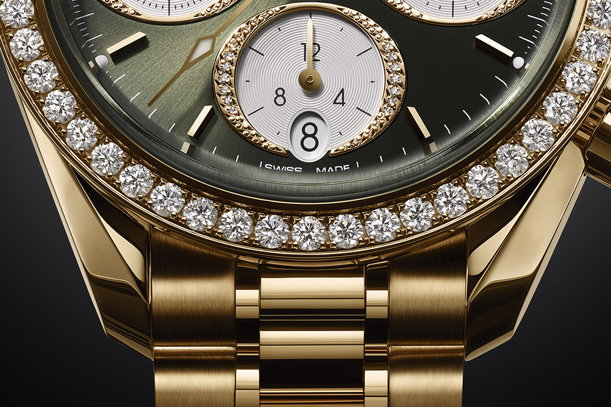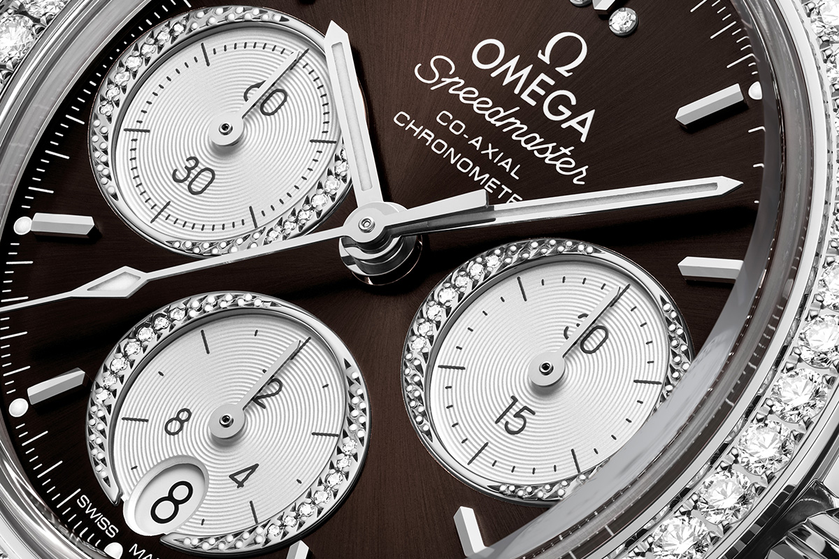 Del resto, il côté glam (come direbbero i francesi) dello Speedmaster 38 è evidente fin dalla prima occhiata. Rispetto alle versioni già in catalogo, infatti, gli esemplari più attuali presentano dettagli in grado di cambiare i segni distintivi della collezione stessa, senza snaturarla. Via la caratteristica doppia lunetta del passato, per esempio. Definita dalla scala tachimetrica interna circondata all’esterno da piccoli diamanti, lascia ora il posto a un singolo giro di diamanti di grandi dimensioni, che in totale raggiungono addirittura un carato e mezzo. Di elevata qualità, con il loro fuoco sprigionano bagliori iridescenti che fanno brillare ogni orologio di luce propria.