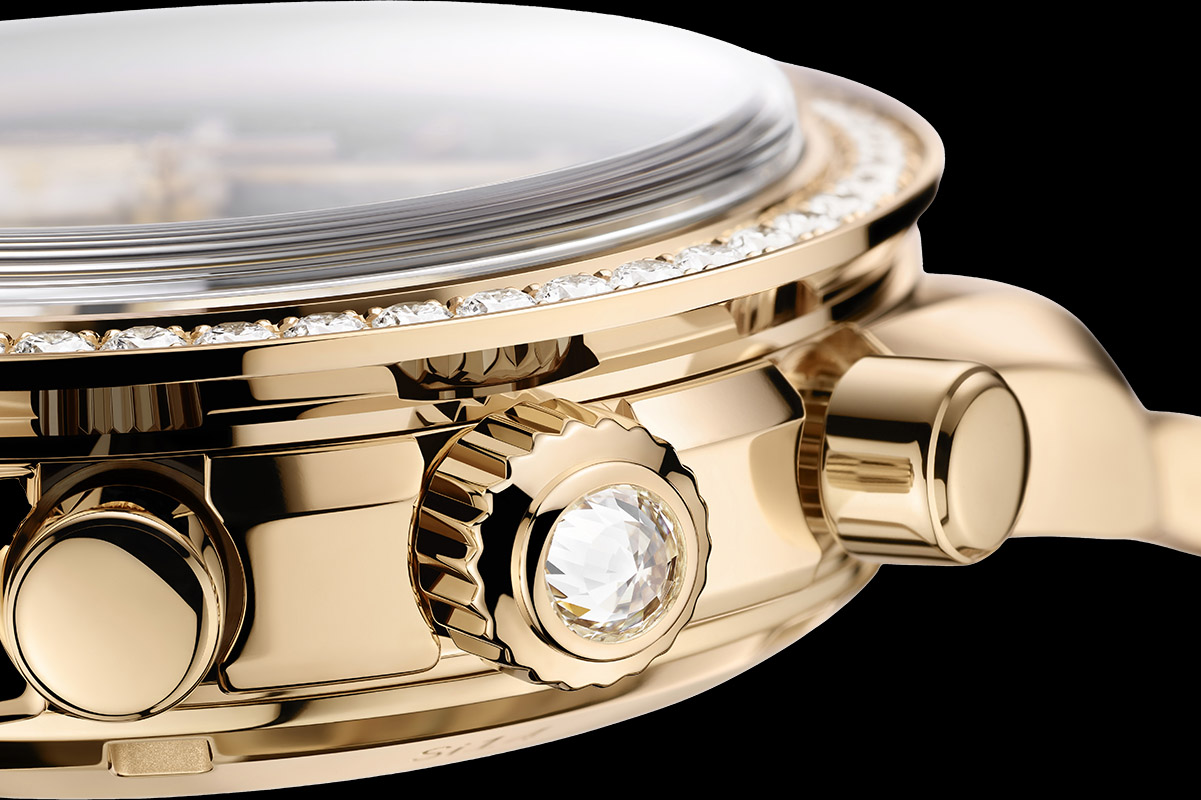 Quindi i tipici contatori cronografici di forma ovale, ispirati a certi modelli d’antan della collezione De Ville. I contatori, a dire il vero, sono circolari, ma si trovano inscritti all’interno di un profilo ellittico. Bene. Nei nuovi Speedmaster 38, gli estremi arrotondati sono sottolineati da due parentesi di diamanti fissati da griffe e posizionati a scalare, più grandi al centro e via via più piccoli verso le estremità, fino a diventare semplici punti metallici. Non un lavoro da poco per il maestro incastonatore… Ma di sicuro di grande efficacia, visti gli effetti luminosi creati all’interno dei contatori stessi.