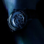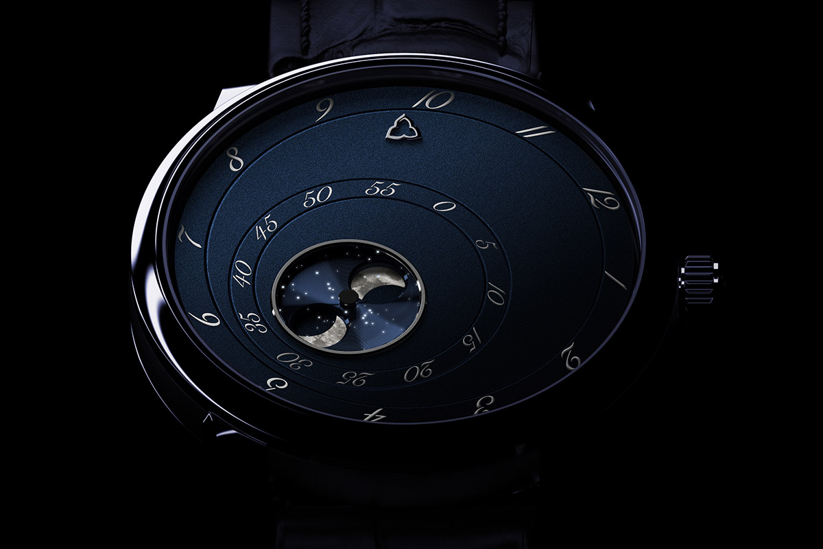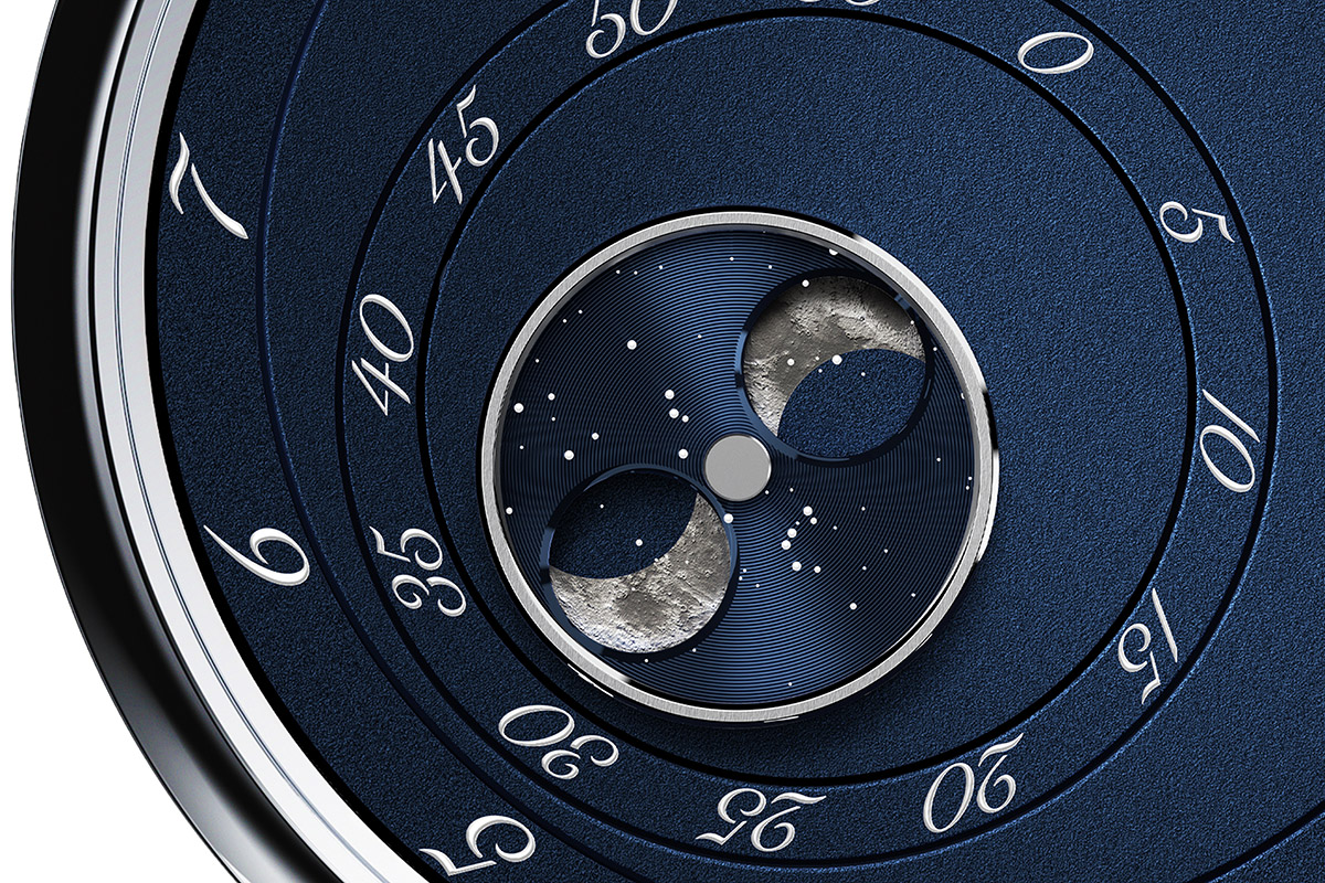 Se si osserva bene, si nota un disco in vetro zaffiro con stelle bianche tampografate. Il vetro zaffiro stellato ruota al ritmo dei secondi e l’indicazione di questi ultimi diventa quindi una rappresentazione astratta del tempo, indicando più che altro il fatto che l’orologio è in funzione. Al di sotto di esso, un disco blu rifinito con scanalature concentriche si muove su un disco di ottone testurizzato al laser, che riporta raffigurata la superficie della Luna.