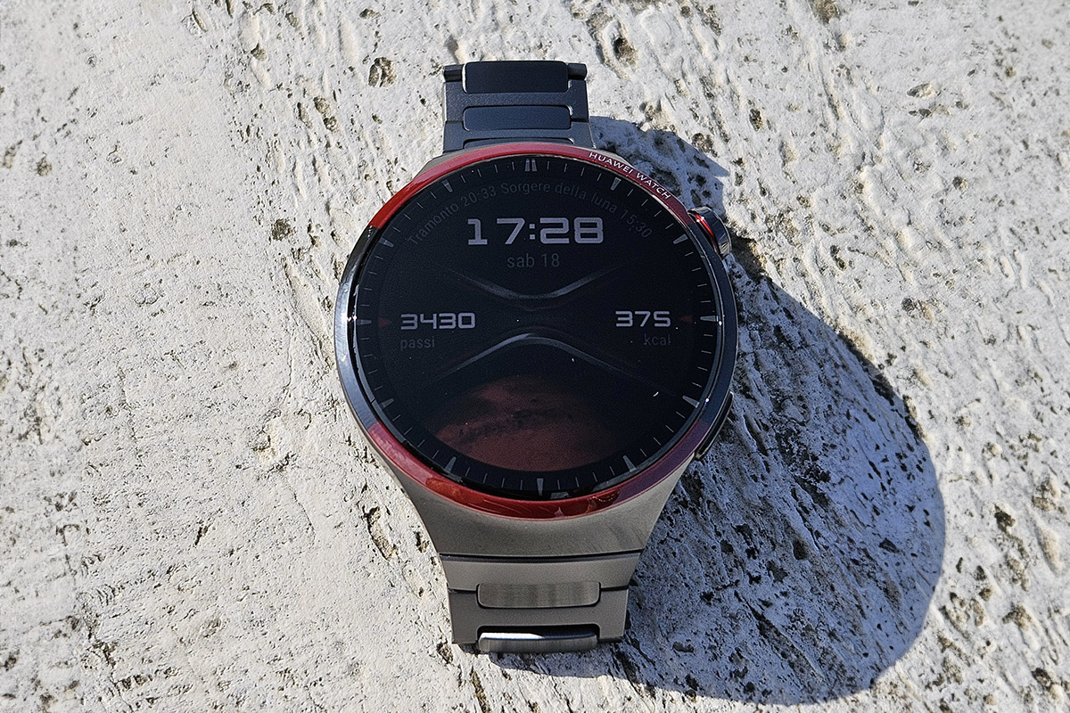 Un rivestimento Dlc (Diamond like carbon, carbonio dalla durezza del diamante) di colore nero non solo incrementa ulteriormente la resistenza ai graffi e all’usura, ma rende anche il device visivamente più aggressivo e adatto a ogni situazione, dal business casual alle attività sportive. Il quadrante Amoled da 1,5 pollici, con una risoluzione di 466×466 pixel, è protetto da un vetro zaffiro bombato, mentre la lunetta è in ceramica nanocristallina rosso-nera e il fondello è sempre in ceramica. Anche questi sono materiali ben noti in orologeria e qualitativamente notevoli: il vetro zaffiro è particolarmente duro (è corindone sintetico: 9 nella scala di Mohs), resistente agli urti o ai graffi, e mantiene inalterata la propria trasparenza nel tempo. La ceramica è anch’essa leggera e resistente, inattaccabile da graffi, urti, acidi, raggi Uv – verrebbe da dire lifeproof – e biocompatibile.