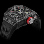 E arriviamo al movimento. A carica manuale, deriva da quello montato nell’RMUP-01, l’orologio ultrapiatto simbolo della collaborazione con la Ferrari – che è stato una sorta di “palestra” in cui i progettisti della Marca sono riusciti a concretizzare nuove idee. Il calibro RM 27-05 ha tuttavia una costruzione più convenzionale, con le tradizionali lancette di ore e minuti poste al centro. E un aspetto che riflette appieno lo stile di Richard Mille, con i componenti scheletrati, la platina e i ponti in titanio grado 5 anneriti da un trattamento Pvd nero.