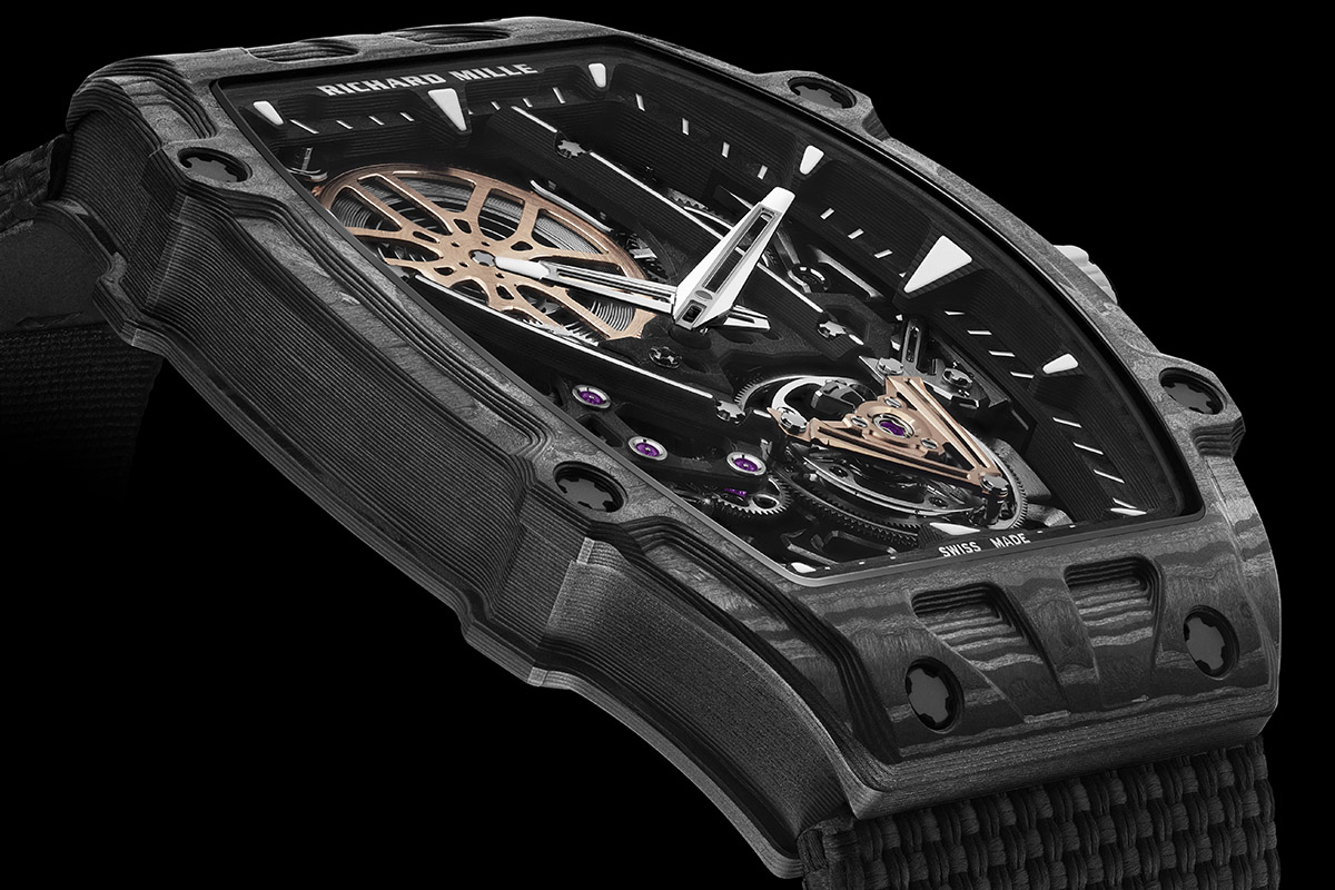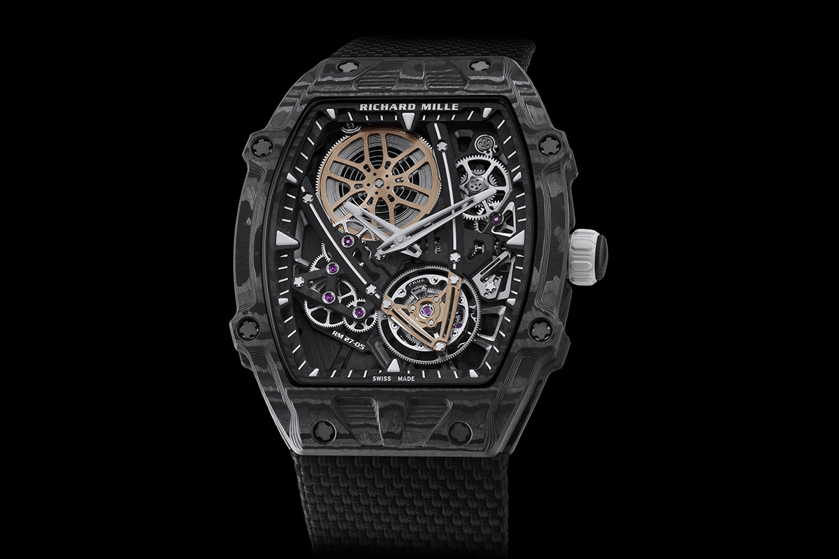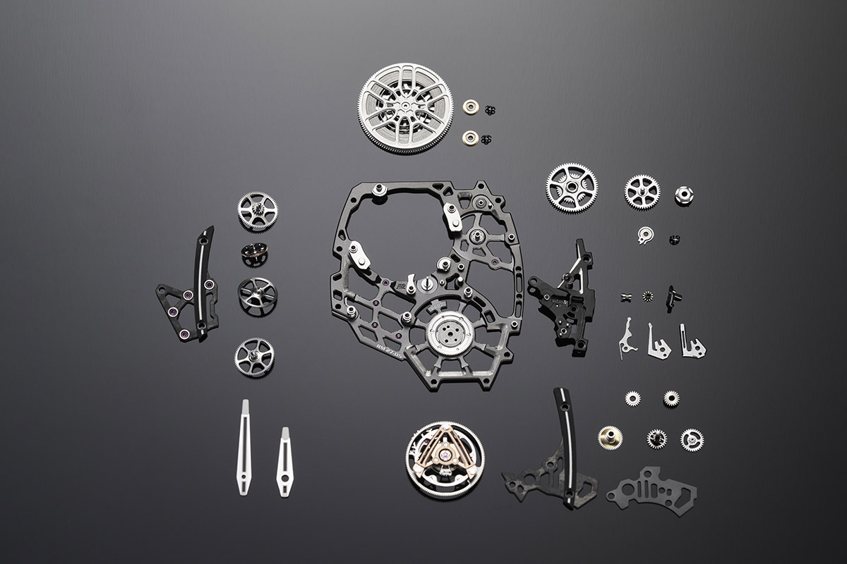 Li passo in rassegna velocemente e invito chi volesse saperne di più a consultare l’archivio dei modelli storici sul sito ufficiale. Nel 2013 c’è stato il lancio dell’RM 27-01: 18,83 grammi (cinturino incluso) e il movimento sospeso su sottilissimi cavi d’acciaio, che gli permettono di resistere a urti fino a 5.000g. Nel 2015 è la volta dell’RM 27-02, 18,3 grammi di peso, con la cassa in Carbon Tpt® e Quartz Tpt® (realizzata in collaborazione con North Thin Ply Technology), e il movimento con la platina scheletrata monoscocca, cioè integrata alla carrure. Architettura che nel 2017 è passata all’RM 27-03, la cui resistenza agli shock raggiunge i 10.000g. Poi, nel 2020, ecco lo spettacolare RM 27-04, con una rete di 844 mm quadrati che funge da platina, resistente alle accelerazioni fino a 12.000g.