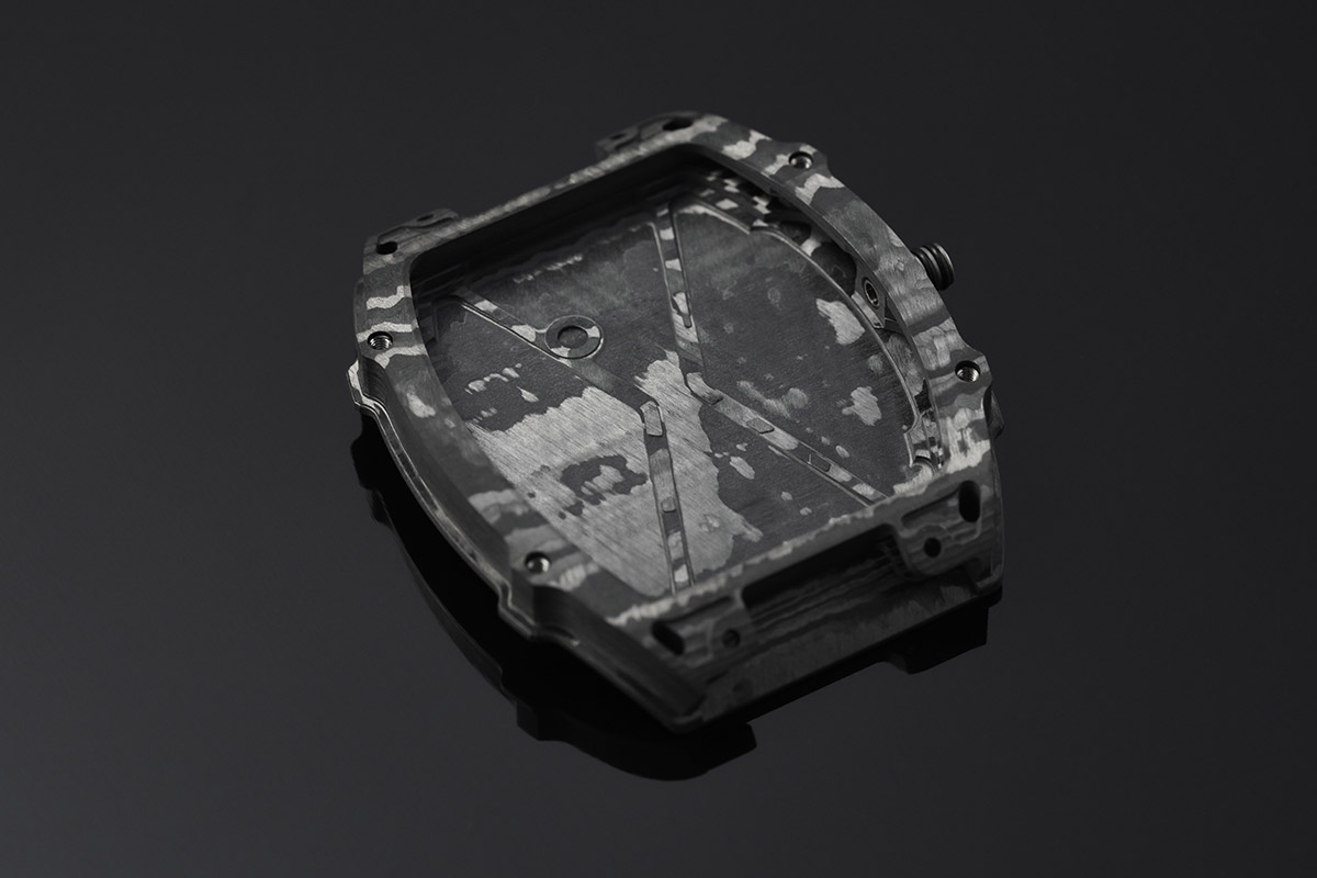 Altra particolarità del movimento è poi il ponte a forma di V che lo attraversa quasi interamente. Realizzato in Carbonio Tpt®, serve a dare stabilità ai ruotismi sottostanti e contribuisce alla rigidità dell’intero sistema. Alla base, invece, le accurate misurazioni in laboratorio hanno dimostrato che il calibro si trova a 5/100 di millimetro dal fondello con la cresta a X, sulla quale poggia attraverso 6 punti di contatto.