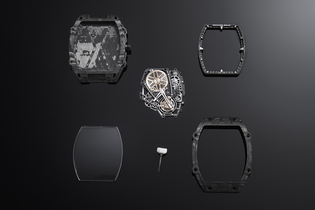 Via anche altri elementi che contribuirebbero al peso dell’orologio: quindi, niente quadrante, come sempre nei Richard Mille. E niente vetro zaffiro, non abbastanza leggero, sostituito invece da una materia plastica di alta qualità. Un polimero Pmma (polimetilmetacrilato), la cui eccezionale trasparenza evita di dover applicare trattamenti antiriflesso. Necessario è solo il rivestimento antigraffio.