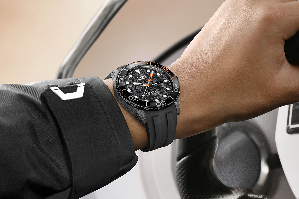 Come se non bastasse, il movimento incassato nel Mido Ocean Star 200C Carbon, ossia il Calibro 80 a carica automatica derivato dall’Eta C07.821, si affida a un bilanciere con spirale in silicio. Materiale insensibile ai campi magnetici che, perfino nelle profondità marine, non andranno mai a compromettere la costanza di marcia. Cui contribuiscono anche le 80 ore di carica completa: un’autonomia così lunga infatti, significa infatti che l’amplitudine del bilanciere – la cui frequenza è di 21.600 alternanze/orarie – rimane più a lungo costante nel tempo. Senza dimenticare i vantaggi pratici: poter riporre l’orologio al venerdì sera e ritrovarlo perfettamente in orario al lunedì mattina. Anche se – ci scommetto – sarà difficile privarsi dell’orologio proprio durante il weekend, visto che sembra fatto apposta per le giornate al mare.