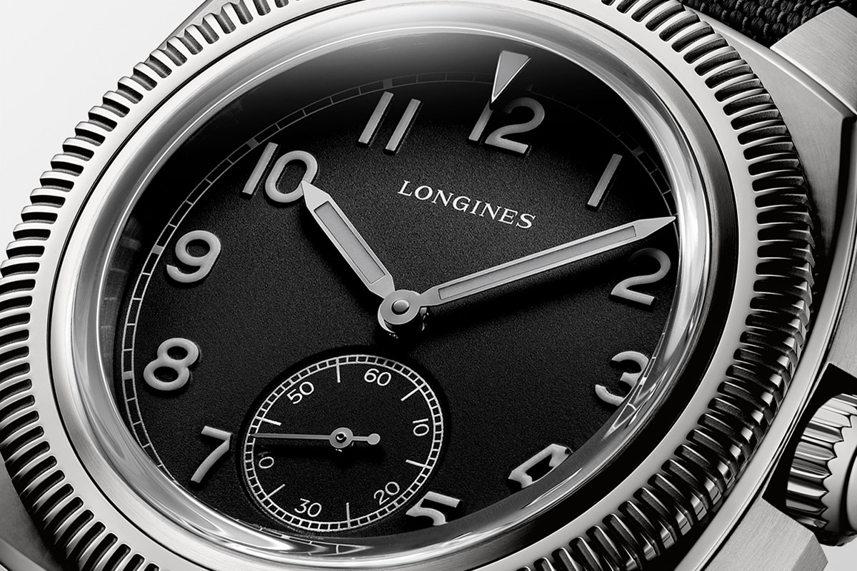 Presente anche il contatore dei piccoli secondi a ore 6 e l’indice a freccia con punta rovesciata in abbinamento alla lunetta zigrinata girevole in entrambe le direzioni. Un modo immediato per fissare, anche con i guanti da aviatore, un punto temporale di partenza (Starting Time Indicator). Nel Longines Pilot Majetek del 1935 il triangolo rovesciato ruotava insieme al vetro. Oggi il vetro resta invece fisso, contribuendo all’impermeabilità dell’orologio che si attesta sui 10 bar.