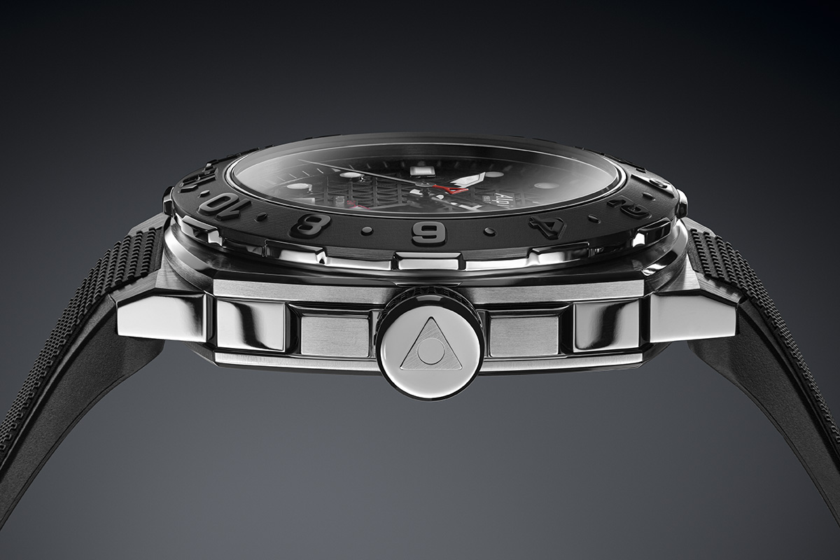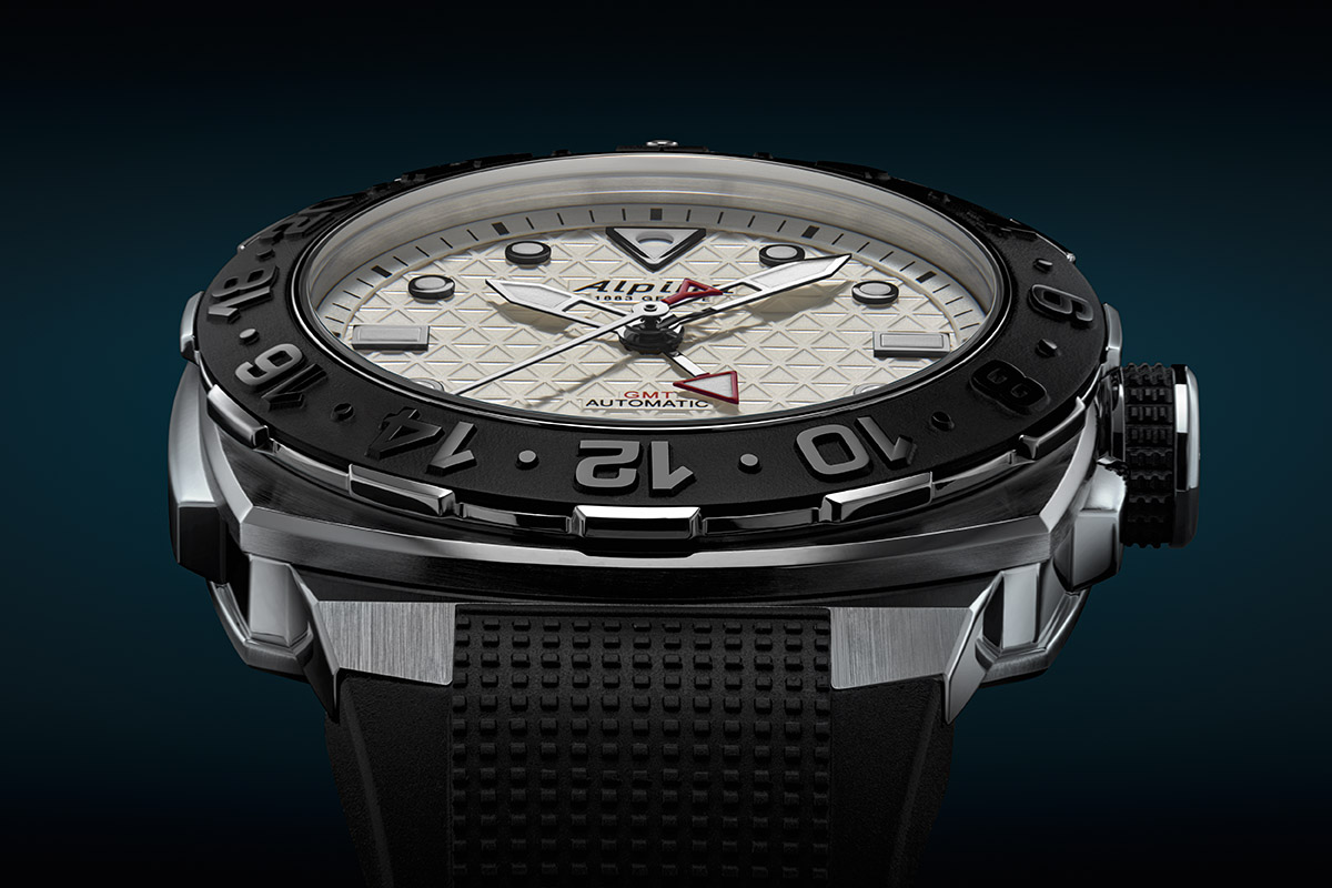 Due le referenze dell’Alpina Seastrong Diver Extreme Automatic Gmt (AL-560B3VE6 e AL-560LG3VE6): una con il quadrante nero, cromaticamente coerente con la lunetta in ceramica e il cinturino in caucciù; l’altra con il quadrante panna, che risalta per contrasto nell’intero abbigliamento. In entrambi i casi, il quadrante è decorato con un motivo a triangolo, la figura geometrica cara alla Marca in quanto diretto rimando al logo. Le sfere delle ore e dei minuti sono a spada e per metà traforate (la parte piena è rivestita di materiale luminescente). La lancetta del secondo fuso orario termina con un generoso triangolo dai bordi rossi e dall’interno luminescente, e il triangolo ritorna anche nel contrappeso della lancette dei secondi. A ore 6 si trova la finestrella della data, che spicca soprattutto nella referenza con quadrante nero.
