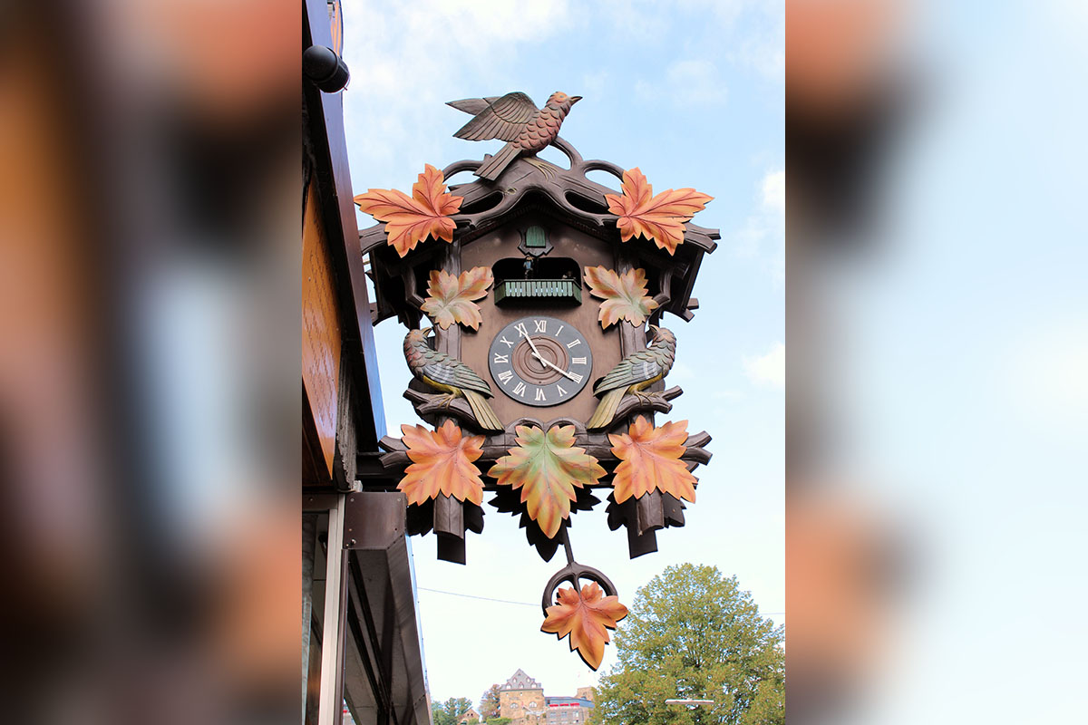 Per i puristi del genere, il vero orologio a cucù dovrebbe essere appeso. Quindi, a buon diritto, le varie case e casette di cui abbiamo parlato nei paragrafi precedenti non dovrebbero essere considerate dei “veri” orologi a cucù. Se vogliamo essere assolutamente aderenti al concetto di orologi a cucù giganti come entità da appendere, perciò non ci resta che tornare in Germania, a Sankt Goar sul Reno, nella regione del Palatinato.