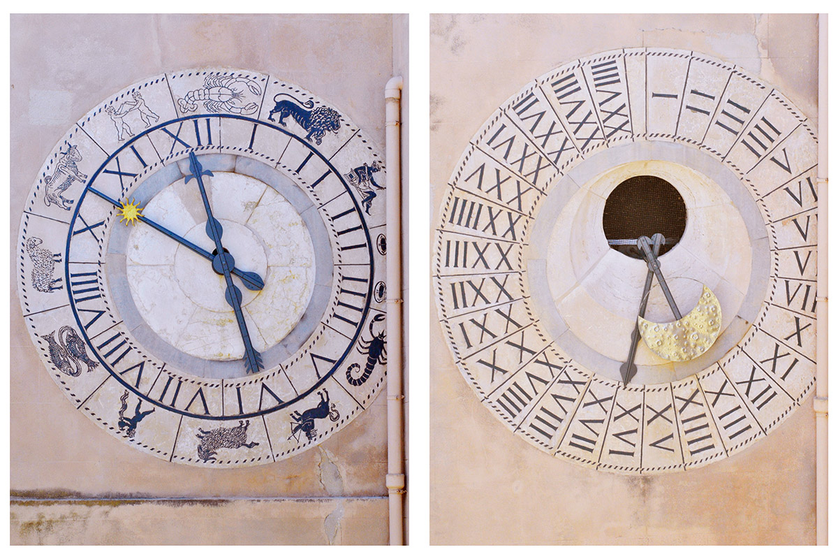 Per prima cosa, dal punto di vista orologistico, ci colpisce l’aspetto dell’esemplare da torre. È insolita la giustapposizione di due grandi quadranti. Quello superiore, che mostra le ore in XII nella fascia oraria interna, è circondato dal ciclo dello Zodiaco. Ai nostri giorni, dopo l’inserimento di un movimento moderno, porta le lancette delle ore e dei minuti. Quello inferiore è attualmente dotato di un indicatore a forma di falce della Luna, mentre anticamente il grande foro decentrato era destinato alla rappresentazione delle fasi lunari. Una fascia esterna è suddivisa in 29 settori e mezzo, con una lancetta che indica il giorno del mese lunare sinodico, la cui durata è, appunto, di circa 29,5 giorni.