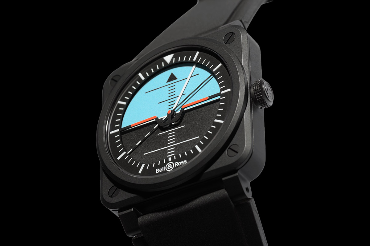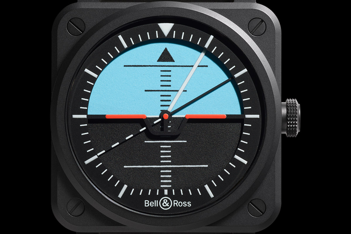 A rigor di cronaca, devo dire però che in passato il Marchio aveva già realizzato un orologio con l’orizzonte artificiale sul quadrante. Lo aveva presentato a Baselworld 2012 insieme ad altri esemplari sempre di derivazione aeronautica, uno con l’altimetro e l’altro con l’indicatore di virata. Il nuovo Bell & Ross BR-03 Horizon rappresenta quindi un’evoluzione rispetto a quel precedente, vivacizzata dal punto di vista cromatico e più sofisticata nelle informazioni. Non si limita infatti a raffigurare il contrasto terra-cielo sul quadrante bicolore (nero e azzurro). Utilizza invece un disco rotante che funge da lancetta delle ore e compie due giri completi in un giorno. L’assetto ideale dell’aereo rispetto all’orizzonte è indicato dalle ali stilizzate rosse che restano fisse e puntano a ore 9 e a ore 3. Con una trovata simile, l’originalità è garantita.