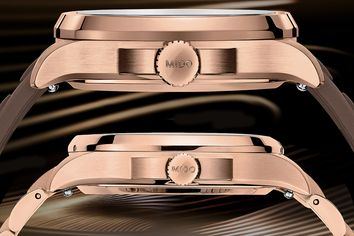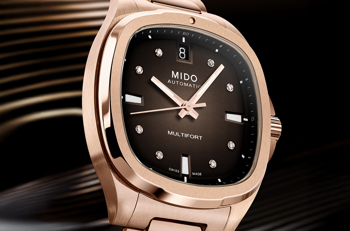 Sviluppato in tre modelli, vede al top quello declinato interamente in oro rosa, con il quadrante in dégradé che va dal cioccolato al nero. Particolarmente riuscito perché fa pendant con una particolare referenza (molto apprezzata) del Multifort Tv Big Date, del quale sembra il pair watch complementare. Però, a guardarlo bene, il Mido Multifort Tv 35 è un orologio del tutto nuovo: non solo è ridotto nella taglia e ovviamente ristudiato nelle proporzioni, ma è anche rivisto nella meccanica. Non monta infatti lo stesso movimento del suo omologo più grande, ma un altro calibro automatico… Vediamolo nel dettaglio.