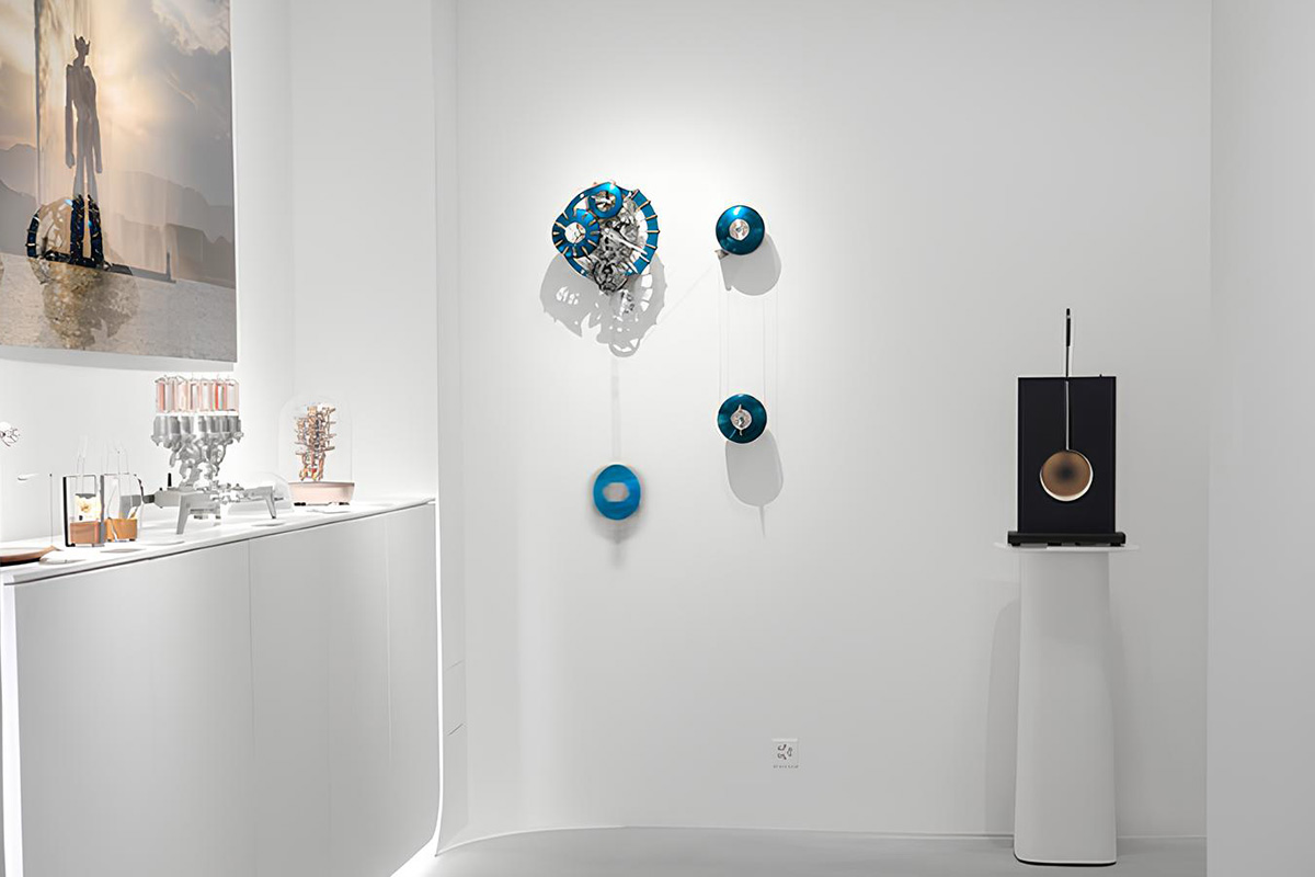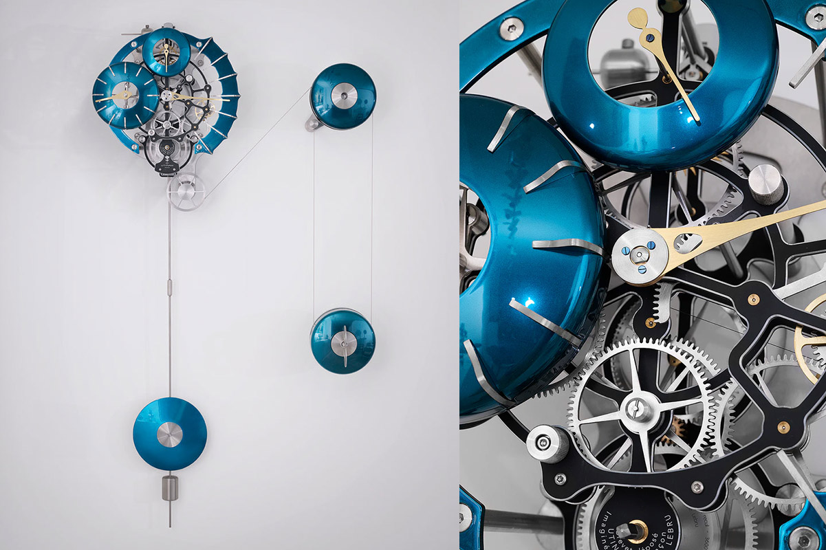 Si ispira invece al nautilus, un mollusco (un cefalopode, per usare il termine scientifico) che da oltre 480 milioni di anni abita le barriere coralline più profonde, il Ballastographe di Utinam. Un orologio a pendolo che sembra galleggiare sul muro, con quel movimento sospeso e autobilanciante (brevettato), i cui pesi offset cambiano posizione in rapporto all’autonomia residua. Con affissione a regolatore e indicazione dei minuti ad andamento retrogrado, mostra i diversi strati della complessa meccanica formata da oltre 400 componenti. In edizione limitata di 88 esemplari, quest’opera riflette le concezioni orologiere di Philippe Lebru: artista, inventore e designer francese, noto al pubblico appunto con lo pseudonimo di Utinam, ha il laboratorio di produzione e la boutique a Besançon.