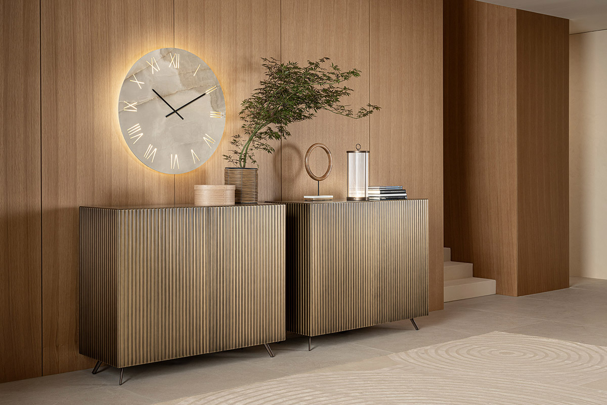 Dall’estetica molto più consueta, sebbene di grande impatto, è invece Portorotondo di Riflessi, azienda italiana di design e arredamento con sede a Ortona (in provincia di Chieti). Scenografico e maestoso, a dispetto del design minimale, è un grande quadrante rotondo (ma è disponibile anche quadrato o tonneau) in ceramica effetto marmo o pietra di vari colori, per un totale di 7 varianti, fra lucide e opache. Finiture che oltretutto permettono di coordinarlo agli altri elementi d’arredo della Casa, come i piani dei tavoli o le ante, i fianchi e i top delle madie. In più, c’è la possibilità di dotarlo di un’illuminazione a led calda, che ne mette in risalto i numeri romani incisi in modo suggestivo.