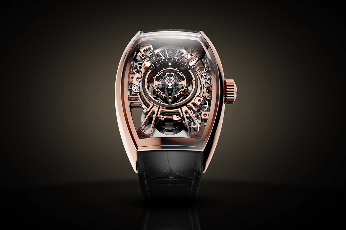È uscita invece nel 2021 la collezione Grand Central Tourbillon di Frank Muller. Anche in questo caso, i tecnici di Watchland hanno dovuto studiare un nuovo sistema per le informazioni orarie, e hanno installato gli indicatori di ore e minuti su due anelli rotanti attorno alla gabbia del tourbillon. Nato all’interno della famosa cassa Cintrée Curvex, ridisegnata ad hoc e sviluppata in diversi materiali/colori, nel 2022 il tourbillon centrale ha quindi trovato posto in una cassa rotonda. Lo scorso anno si è poi vestito di colori vitaminici e quest’anno è stato rivisitato da un’operazione di scheletratura. Il Curvex CX Grand Central Tourbillon Skeleton, infatti, è caratterizzato da quattro lunghi ponti che sembrano tenere in sospensione l’intero movimento. E mostrano il maggior numero possibile di ingranaggi, comprese le ruote di ore e minuti.