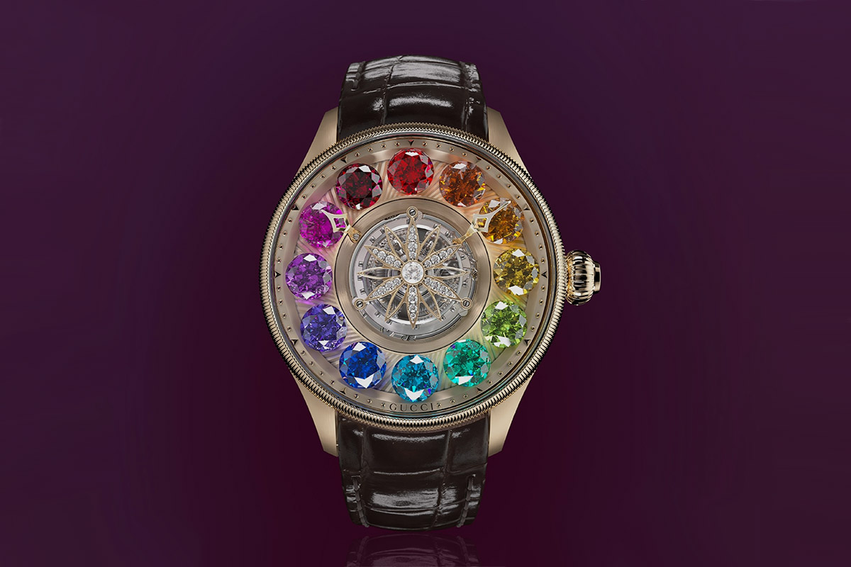 Più spettacolare invece il G-Timeless Planetarium, parte della prima collezione di alta orologeria della Casa, lanciata nel 2022, e da allora riproposto in varie declinazioni. Qui il tourbillon volante è al centro di sistema che evoca la rivoluzione dei pianeti attorno alla propria stella. Non a caso la gabbia del tourbillon è decorata proprio da una stella incastonata di diamanti. Basta premere un pulsante coassiale alla corona per attivare il moto delle ore: 12 gemme dal taglio sferico ruotano attorno al proprio asse in 9 secondi e impiegano 90 secondi per compiere un’intera rotazione del quadrante. Il tutto crea una sorta di danza che dà il nome anche al movimento: Dancing Hours Flying Tourbillon. È probabile che alla base dell’animazione ci sia un dispositivo tipo star wheel, ma Gucci non fornisce spiegazioni riguardo alla meccanica.